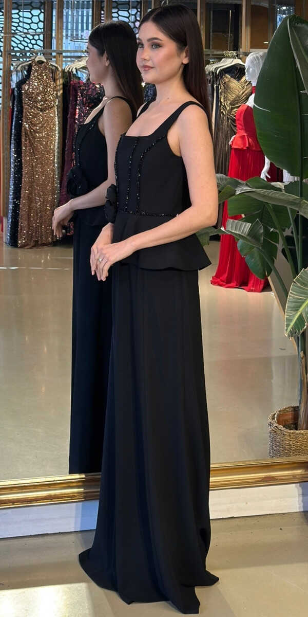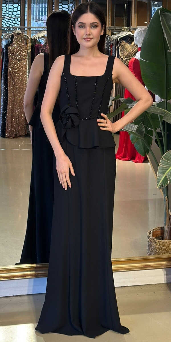 Gelince Haber VerKare Yaka Siyah Renk Düz Kesim Uzun Abiye Elbise, Krep Kumaştan Üretilmiş olup Hafif Ve Daha Az Kırışan Krep Kumaş Sizi Daha Rahat Hissettirecektir. Kalın askılı yapısıyla destekleyici ve modern bir görünüm sağlar. Çiçek Detayı Modern Bir Görünüm Yaratacaktır.