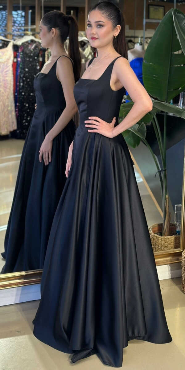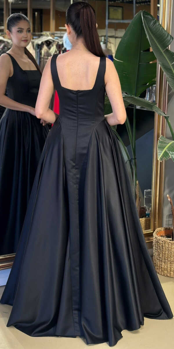 Gelince Haber VerKare Yaka Siyah Renk Kloş Etekli Uzun Abiye Elbise, Tafta Kumaştan Üretilmiş olup İnce, sık dokunmuş hafif sert kumaşı ile özel gününüzde göz alıcı bir duruş sunar. Kalın askılı yapısıyla destekleyici ve modern bir görünüm sağlar.