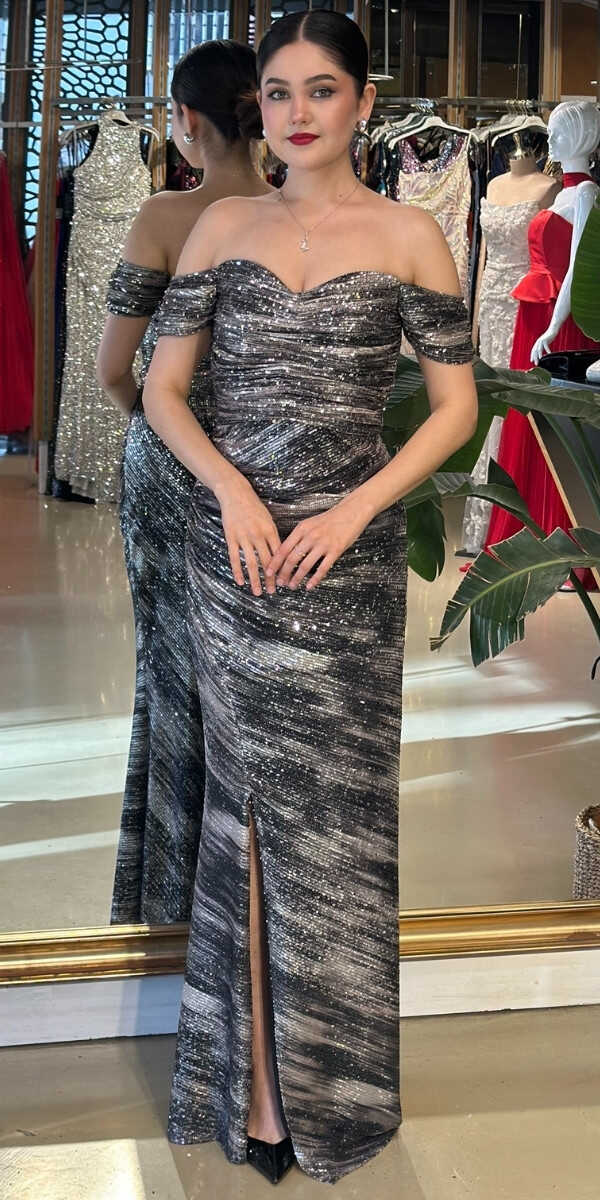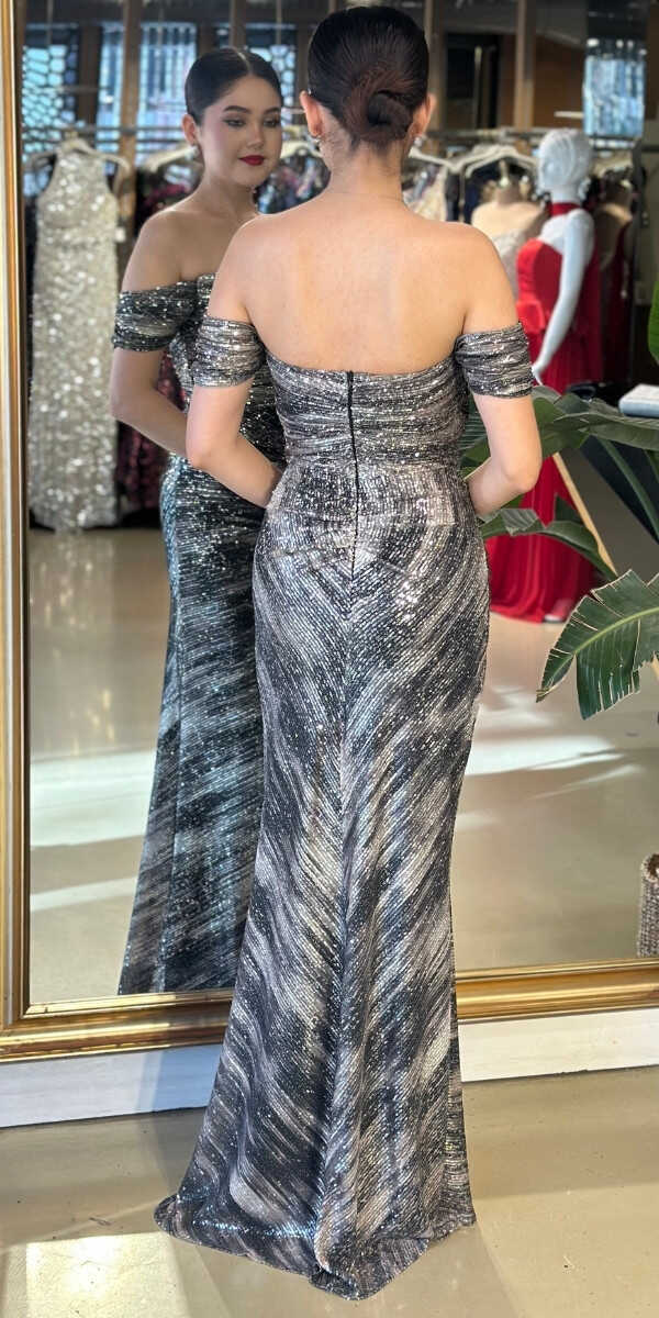 Açık Gri Balon Kollu Dantel Detaylı Düz Kesim Simli Uzun Abiye Elbise 7278
