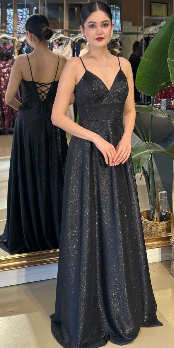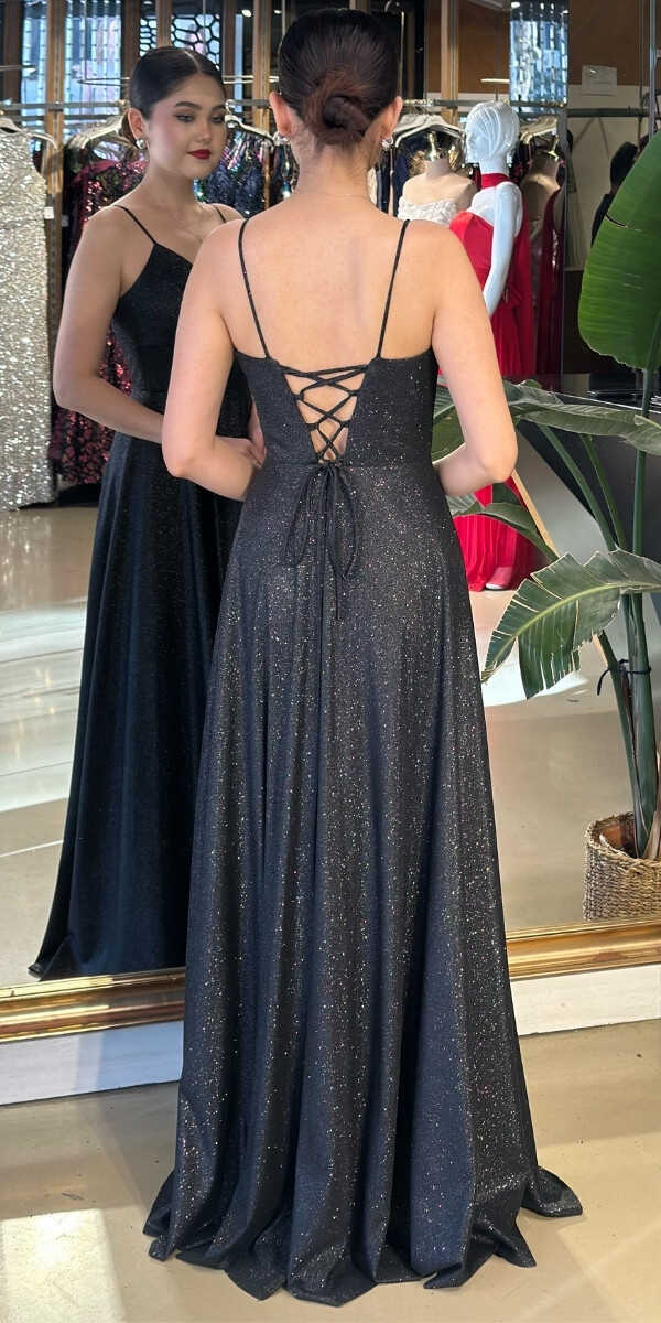 Siyah Simli Uzun Abiye Elbise 6885