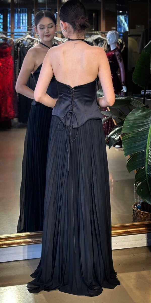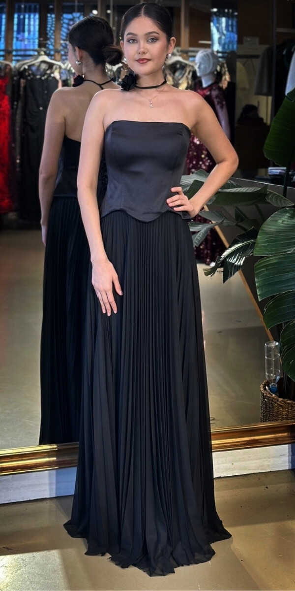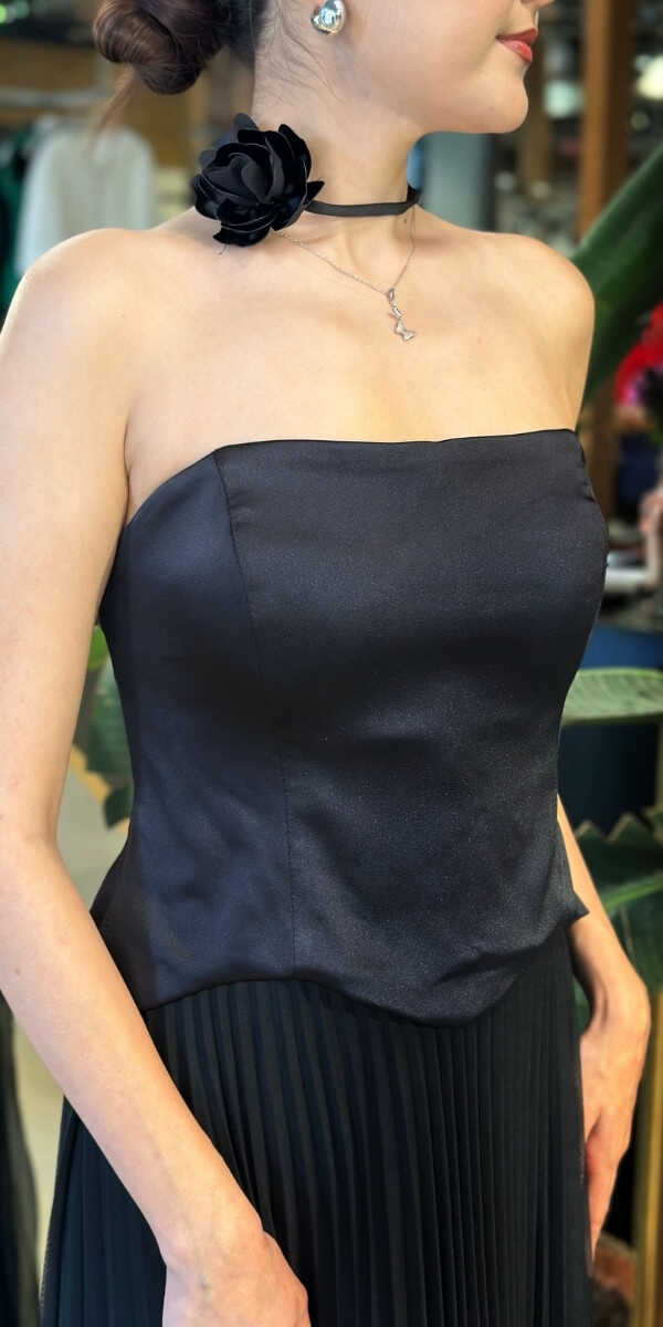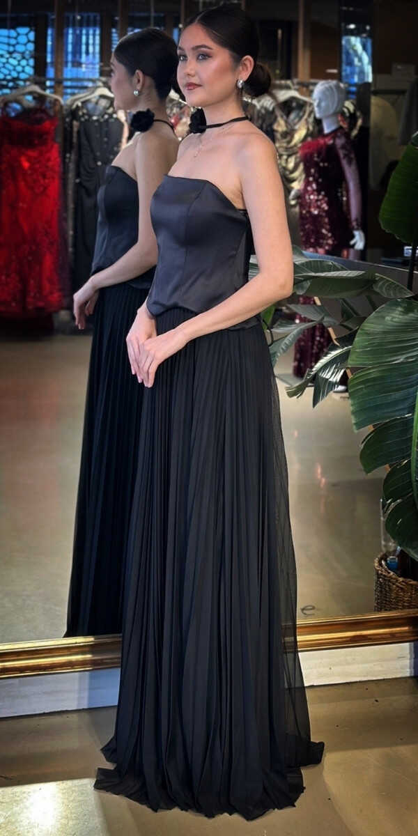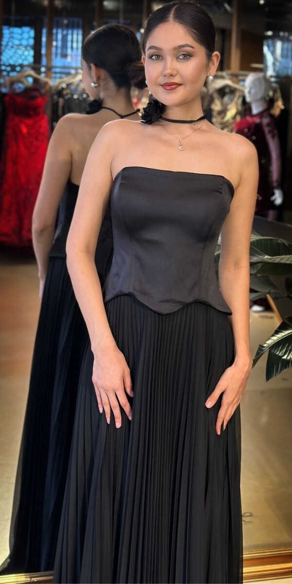 Straplez Yaka Siyah Renk Kloş Etekli Uzun Abiye Elbise, Tül Kumaştan Üretilmiş olup Uçuş Uçuş Şifon Kumaş Tüm Dikkatleri Üzerinize Toplayacaktır. Çiçek Detayı Modern Bir Görünüm Yaratacaktır.