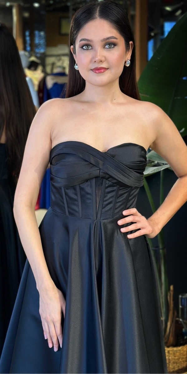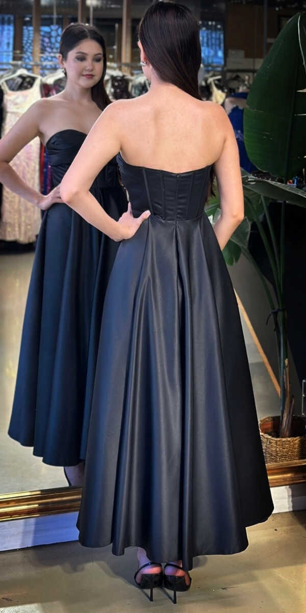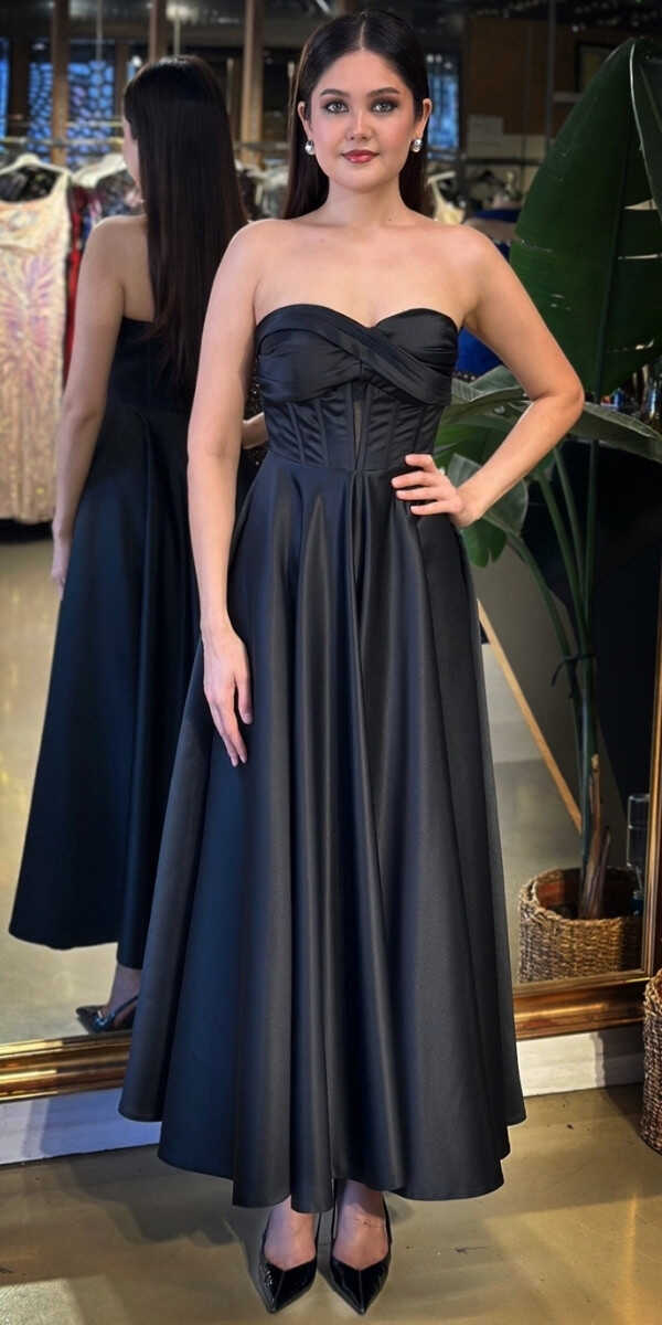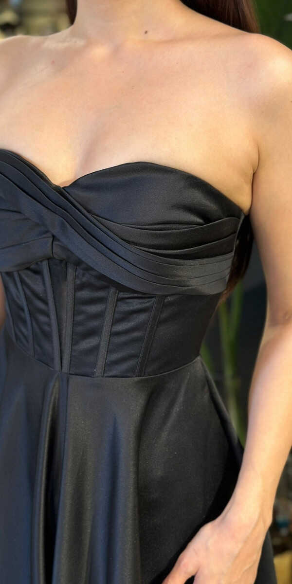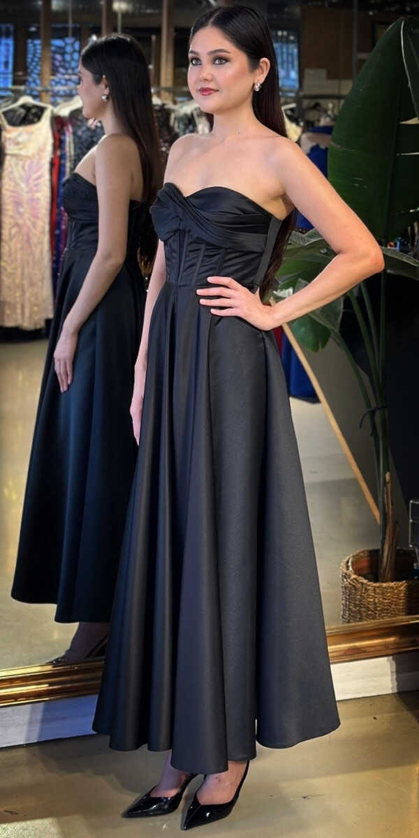 Straplez Yaka Siyah Renk Kloş Etekli Midi Abiye Elbise, Saten Kumaştan Üretilmiş olup Satenin Pürüzsüz Işığı Görünümünüze Zarafet Katacaktır.