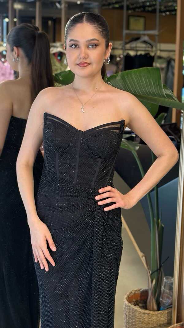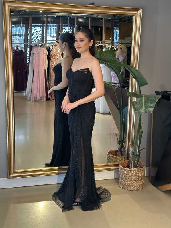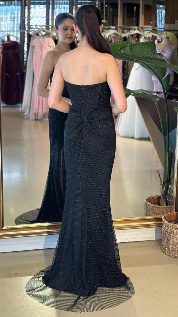 Straplez Yaka Siyah Renk Balık Etekli Uzun Abiye Elbise, Taşlı Kumaştan Üretilmiş olup Parıltısıyla Gözlerinizi Kamaştıracaktır Yırtmaç Detayı Cesur ve Çarpıcı Bir Stil Sunacaktır.