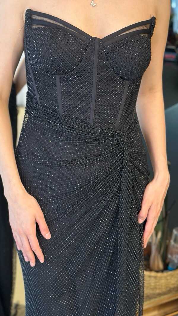 Siyah Straplez Yaka Yırtmaçlı Balık Etekli Taşlı Uzun Abiye Elbise 11171-01