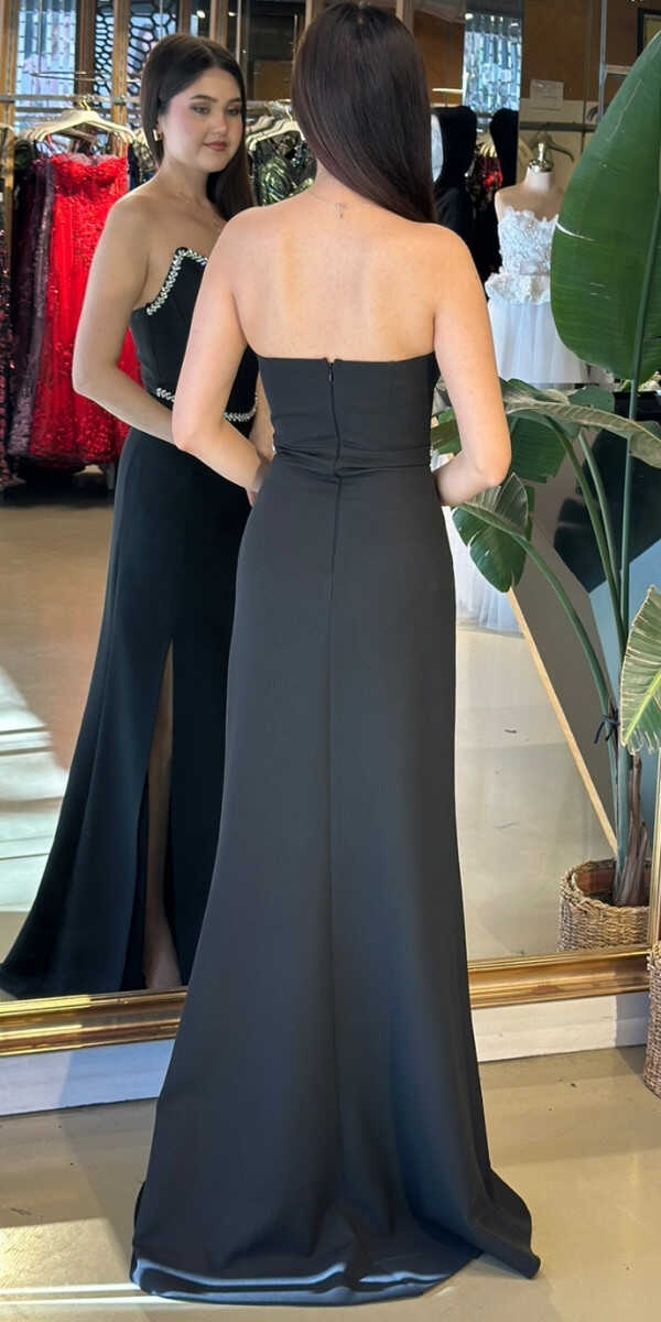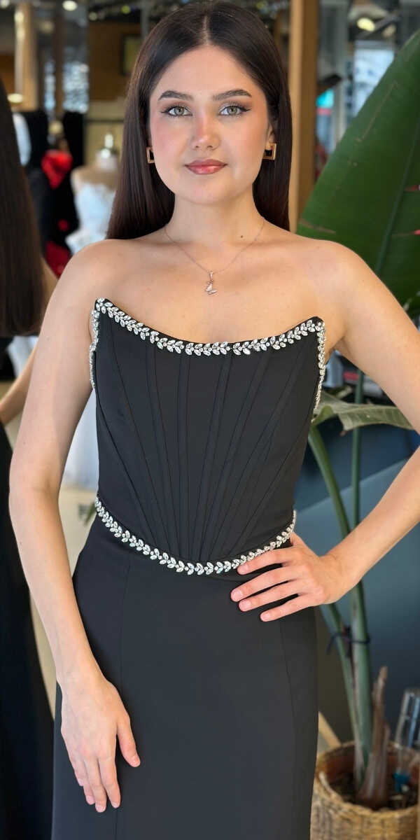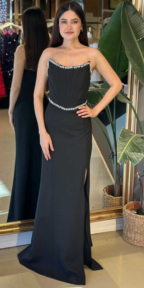 Straplez Yaka Siyah Renk Düz Kesim Uzun Abiye Elbise, Krep Kumaştan Üretilmiş olup Hafif Ve Daha Az Kırışan Krep Kumaş Sizi Daha Rahat Hissettirecektir. Yırtmaç Detayı Cesur ve Çarpıcı Bir Stil Sunacaktır.