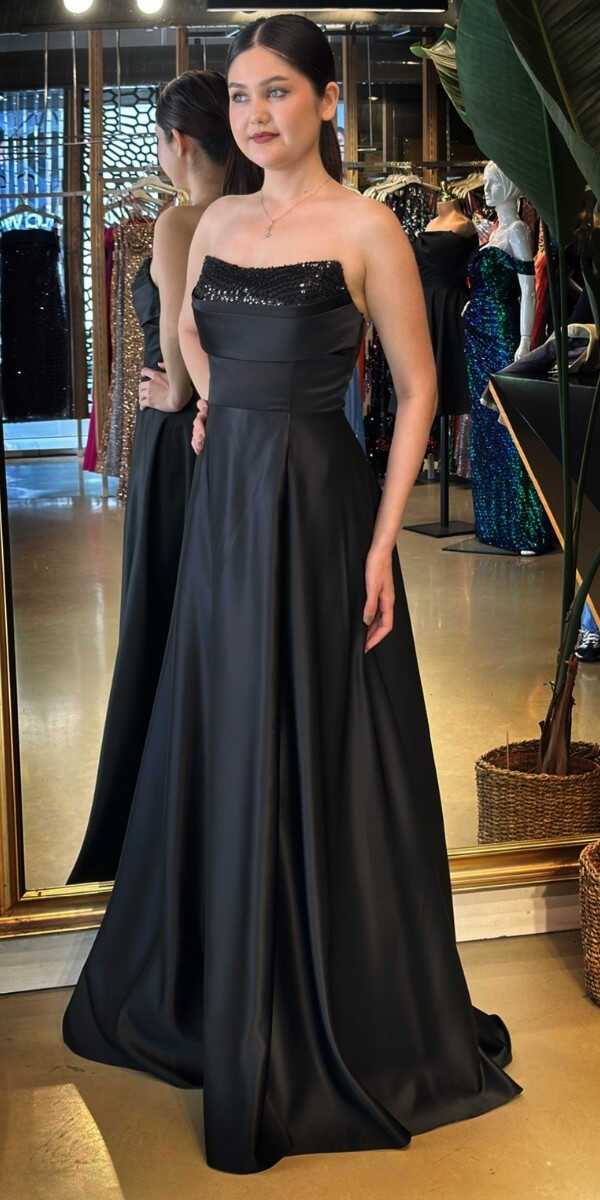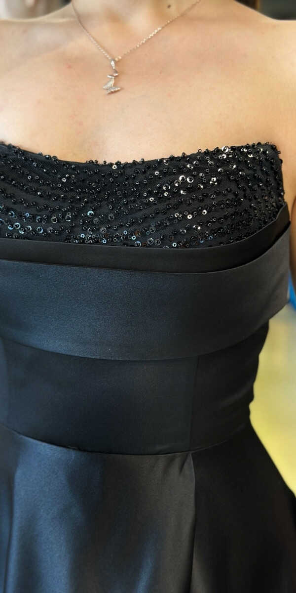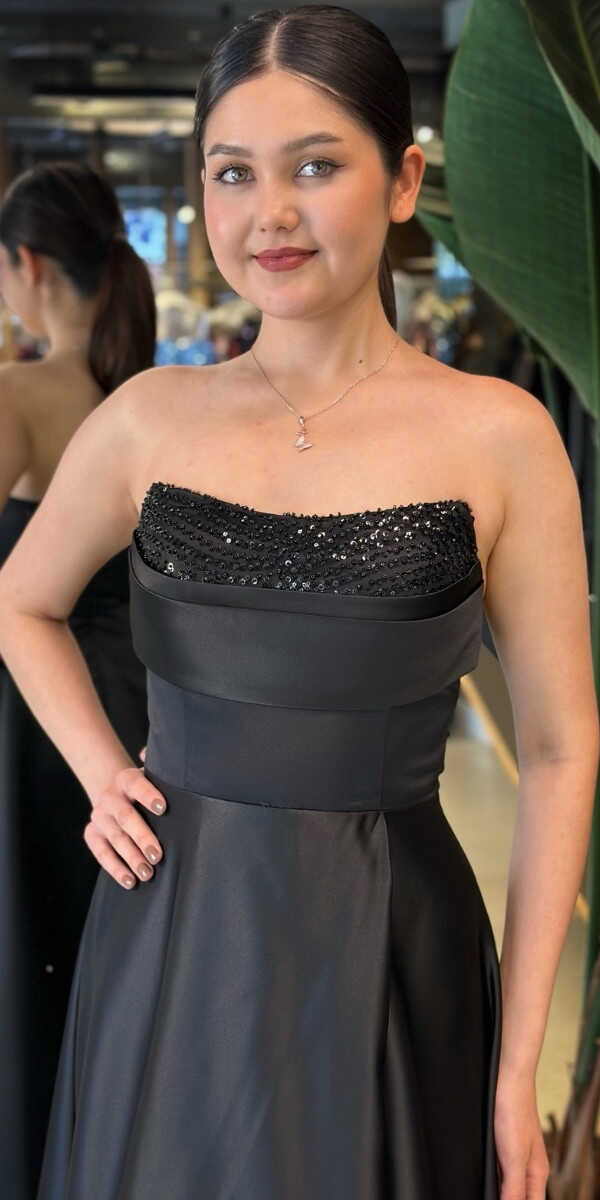 Siyah Renk Kloş Etekli Uzun Abiye Elbise, Saten Kumaştan Üretilmiş olup Satenin Pürüzsüz Işığı Görünümünüze Zarafet Katacaktır. Taşlı Aksesuar Dikkatleri Üzerinizde Toplayacak. Yırtmaç Detayı Cesur ve Çarpıcı Bir Stil Sunacaktır.