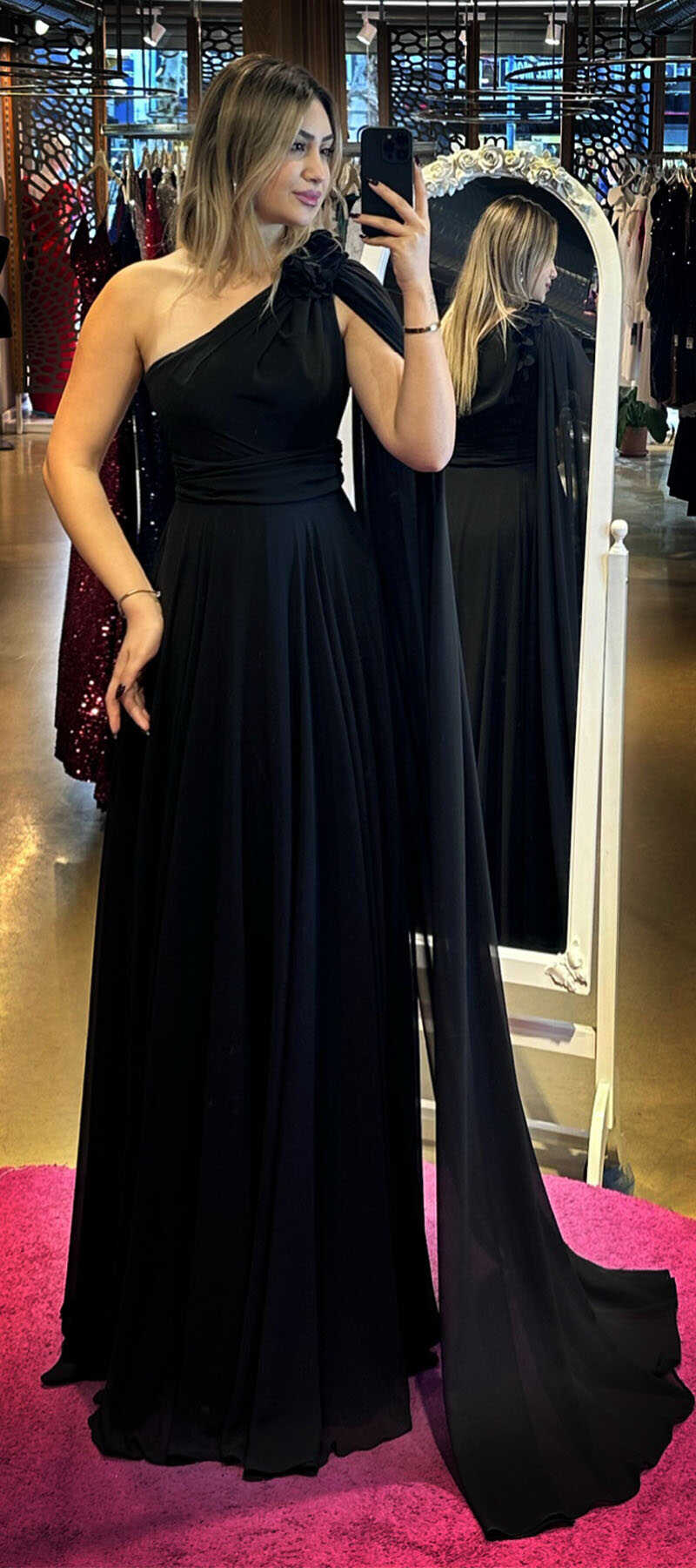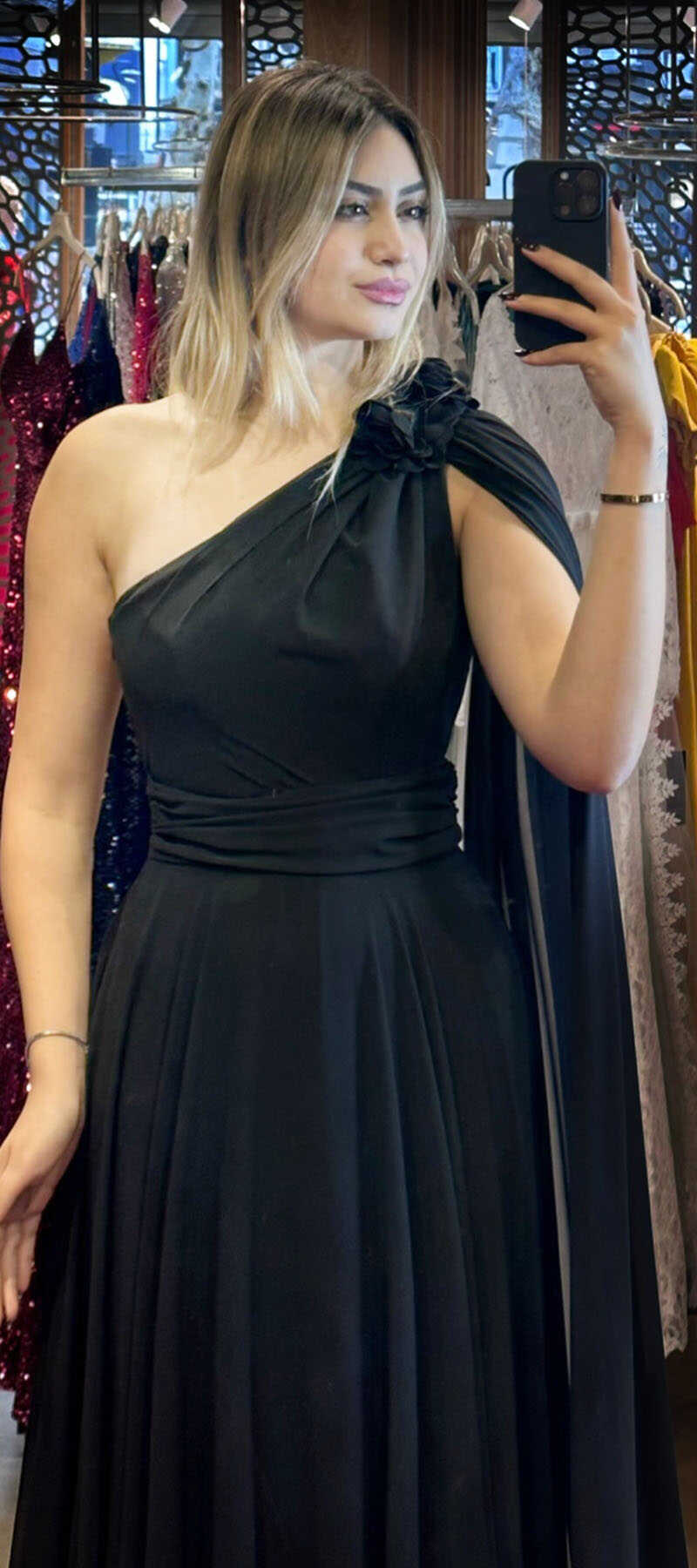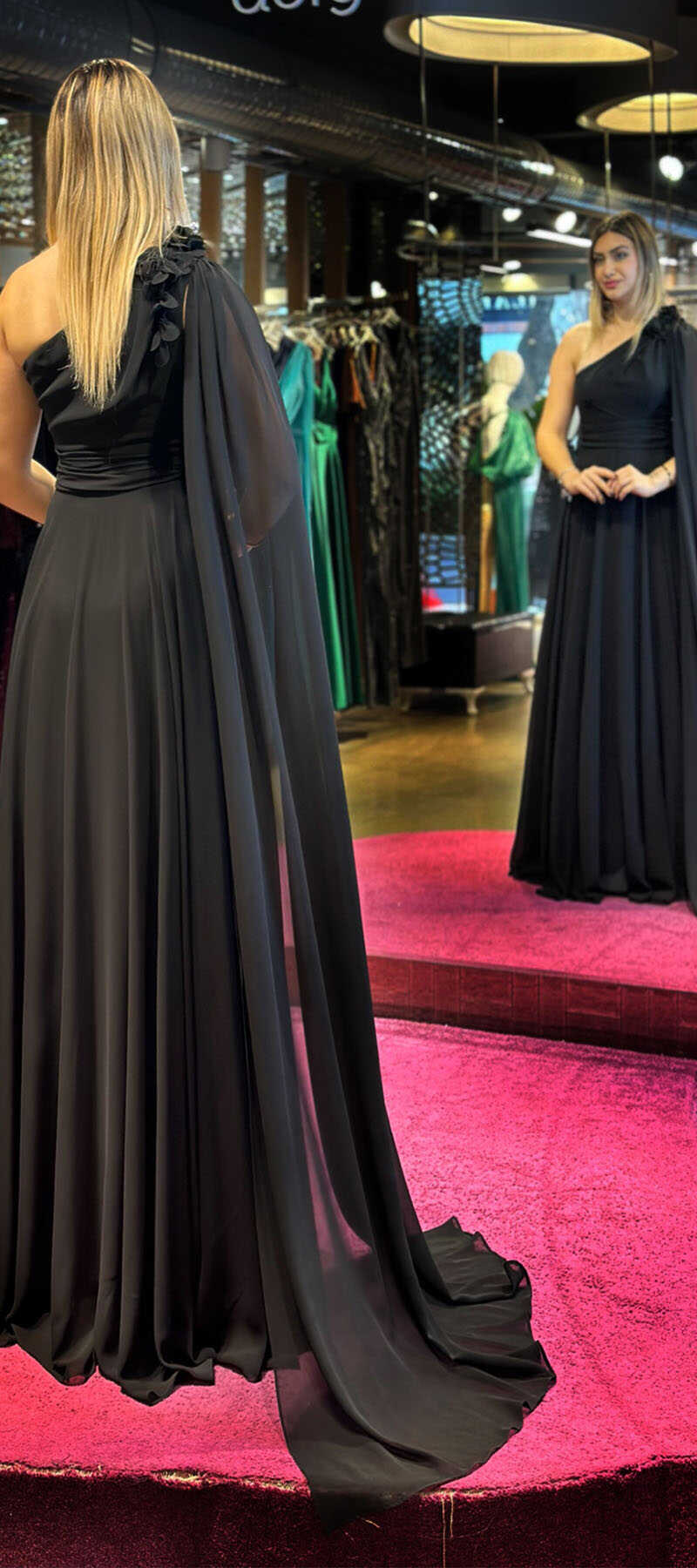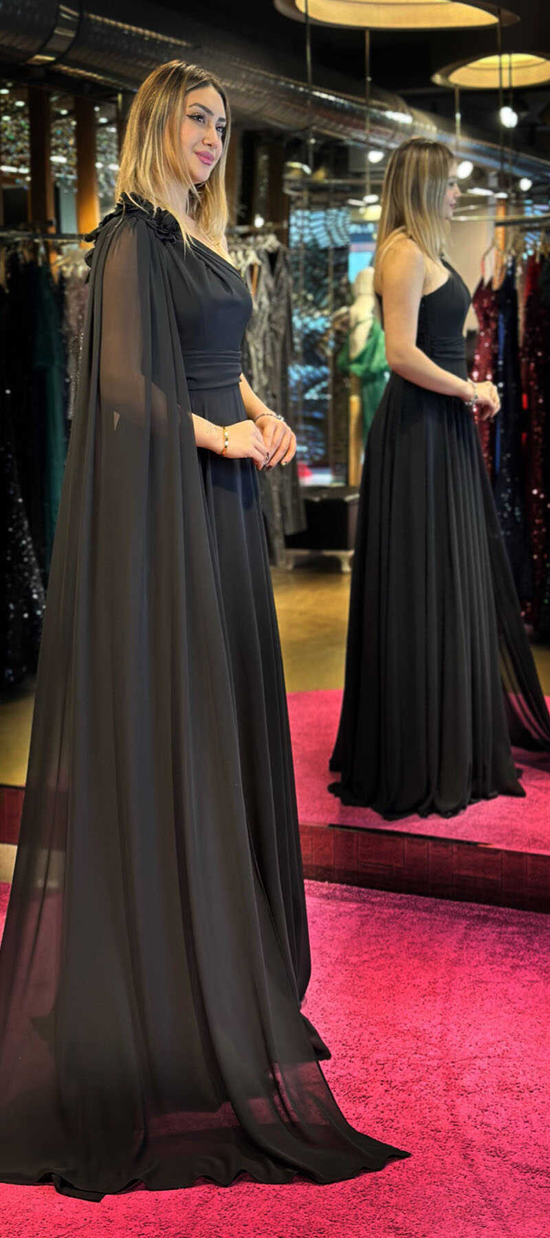 Siyah Renk Kloş Etekli Uzun Abiye Elbise, Şifon Kumaştan Üretilmiş Olup Uçuş Uçuş Şifon Kumaş Tüm Dikkatleri Üzerinize Toplayacaktır. Çiçek Detayı Modern Bir Görünüm Yaratacaktır.