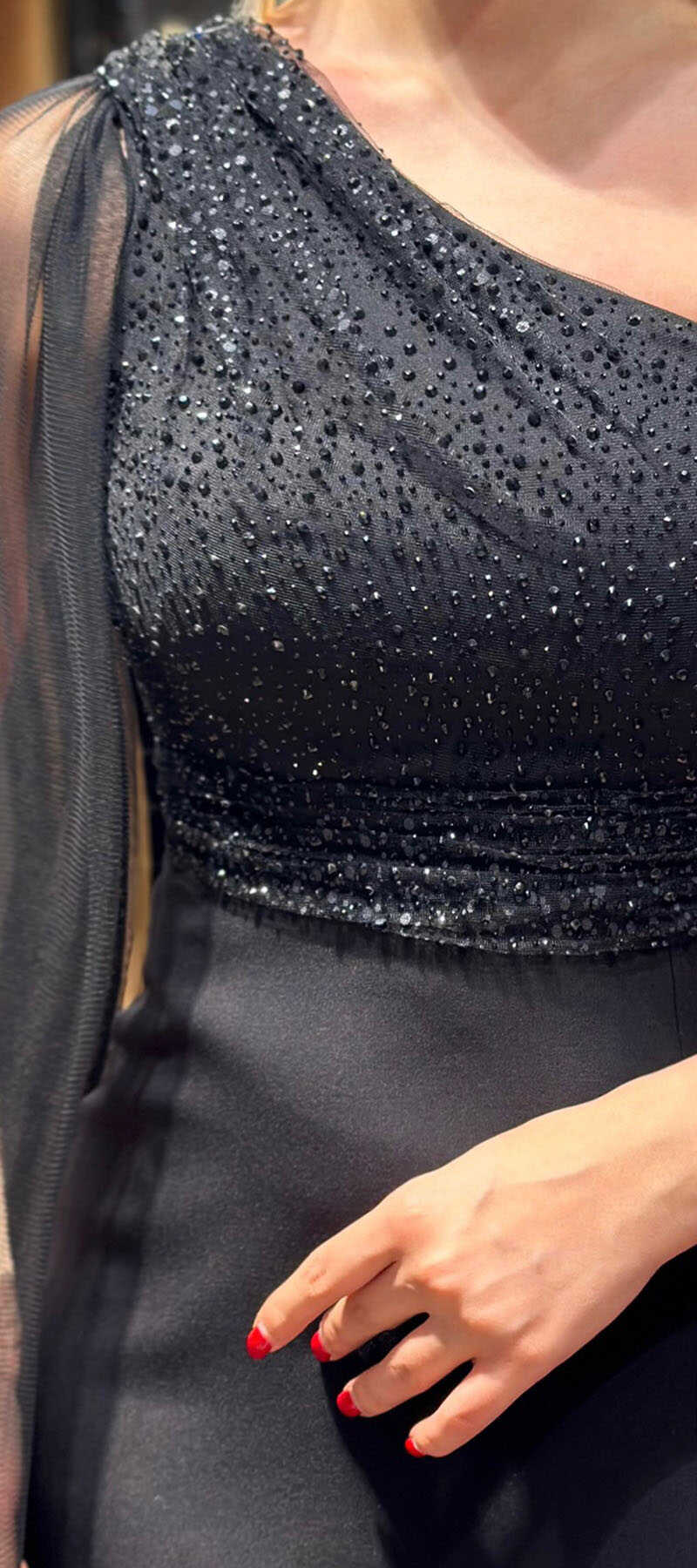 Siyah Tek Omuzlu Yırtmaçlı Düz Kesim Krep Uzun Abiye Elbise 7550