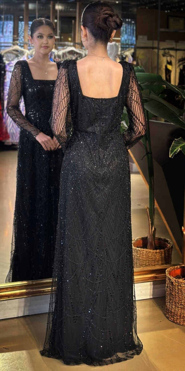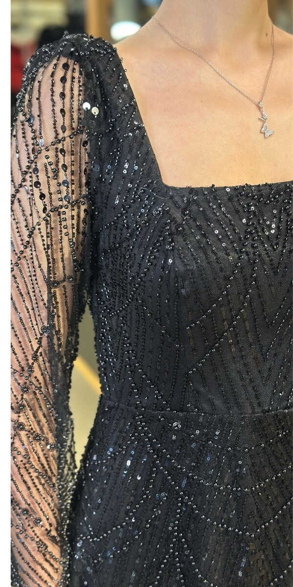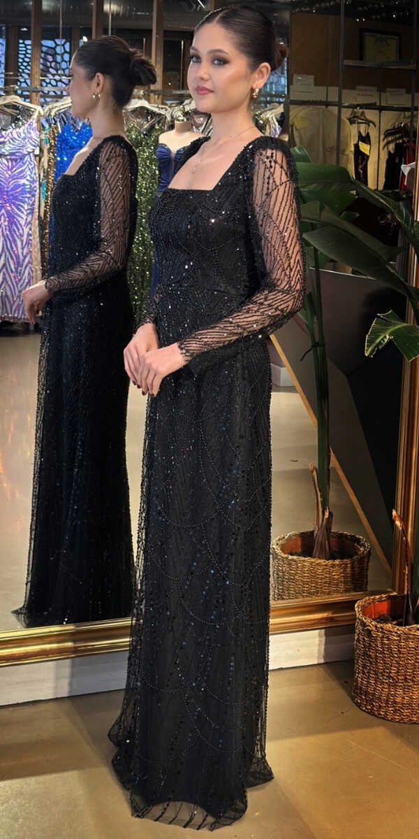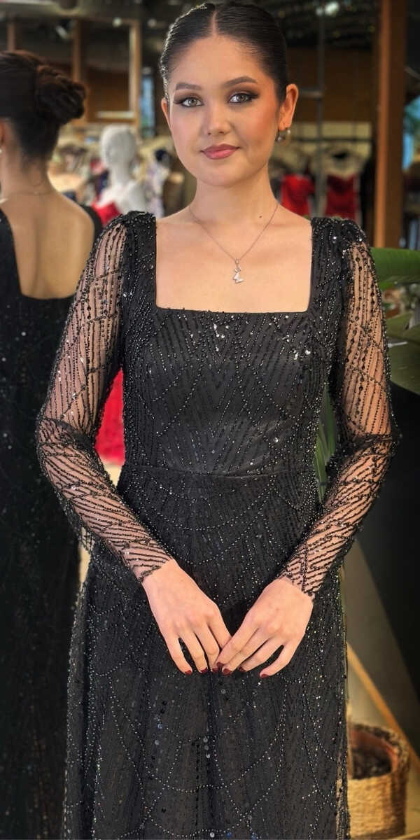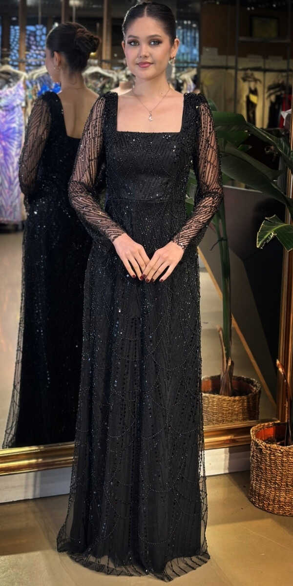 Kare Yaka Siyah Renk Kloş Etekli Uzun Abiye Elbise, Pullu Boncuklu Kumaştan Üretilmiş olup Parıltı ve Zarafetin Buluştuğu Kumaş Türü Sizi Işıl Işıl Gösterecektir. Uzun kollarıyla, kollarınızı zarif bir şekilde kapatır.