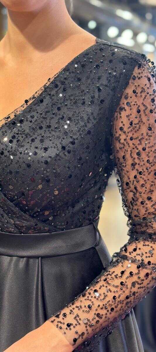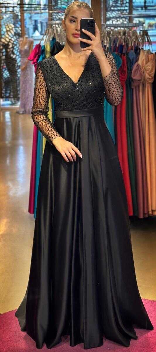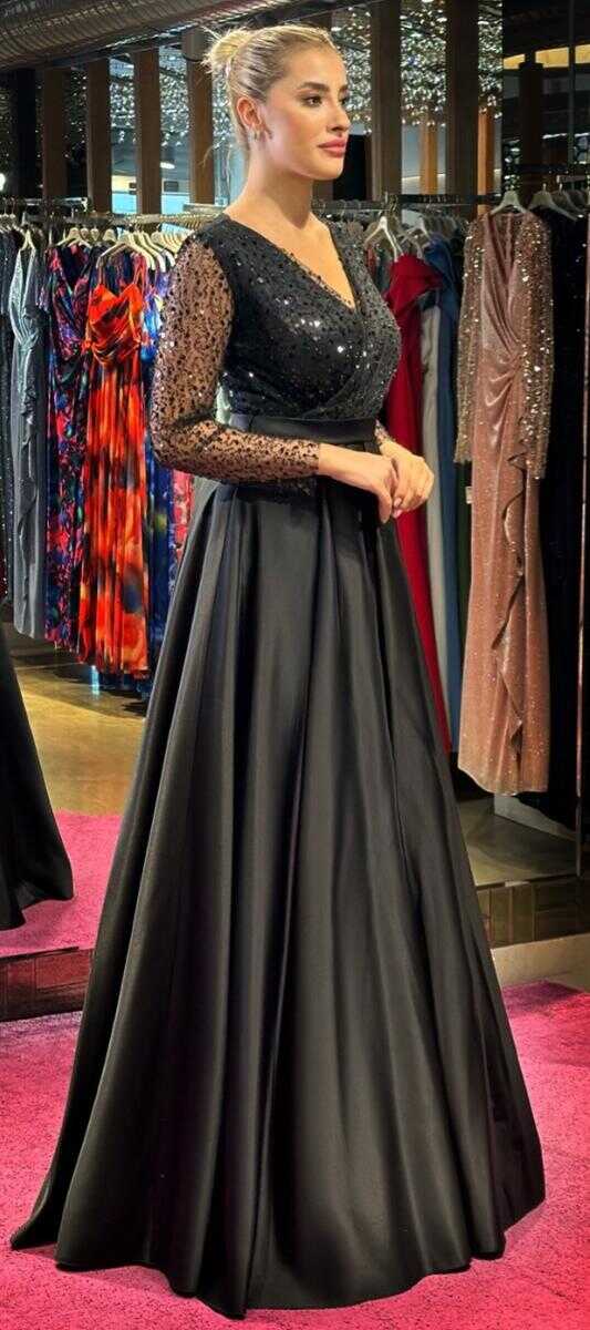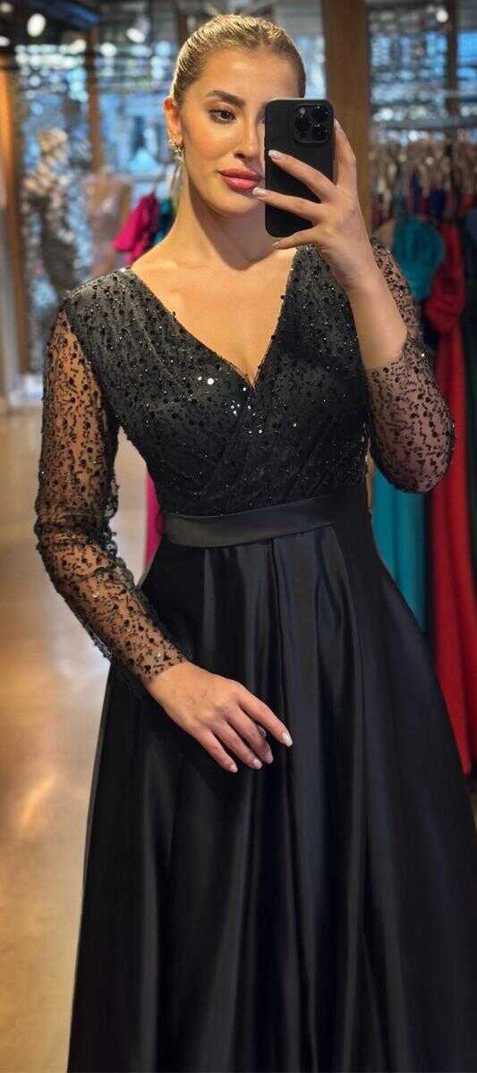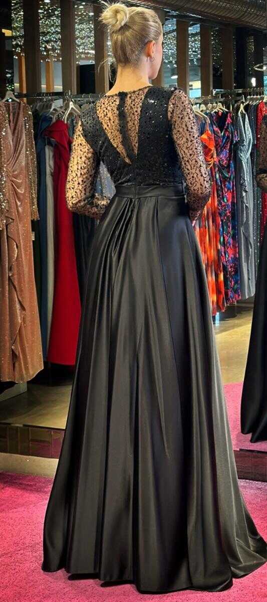 Siyah Uzun Kollu Kloş Etekli Saten Uzun Abiye Elbise 7453