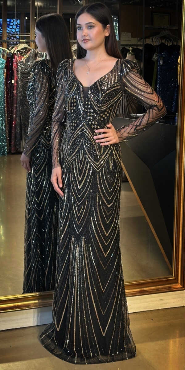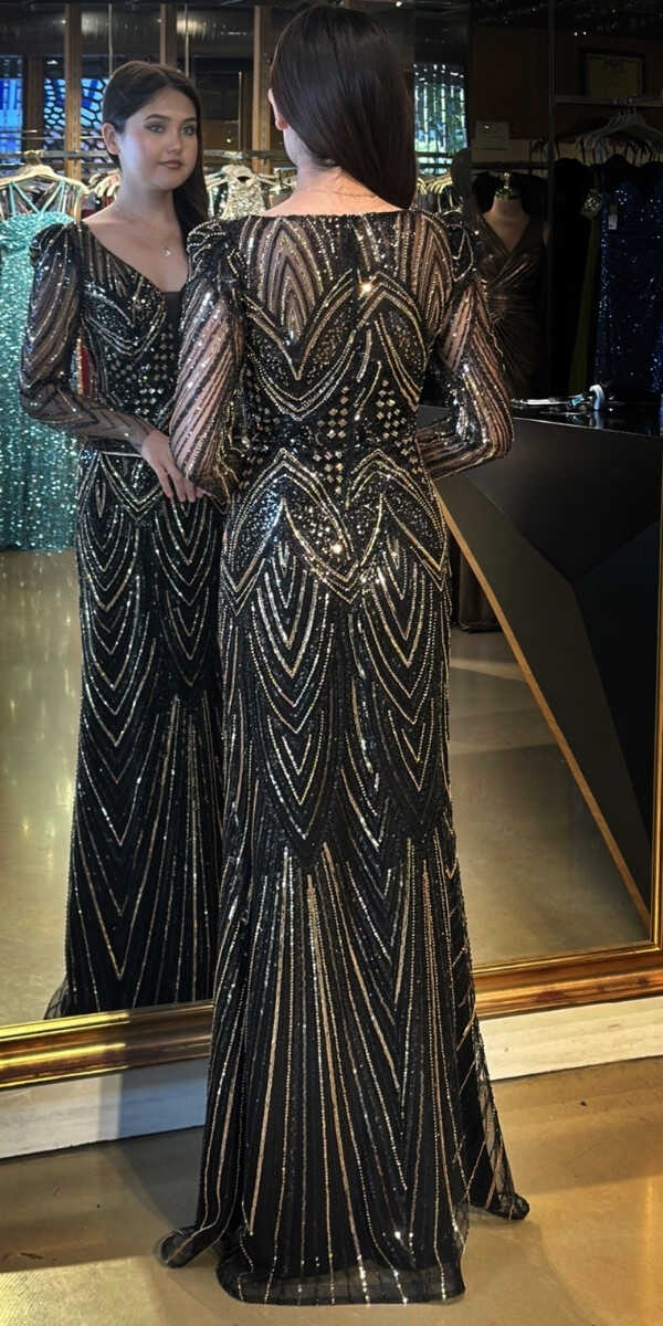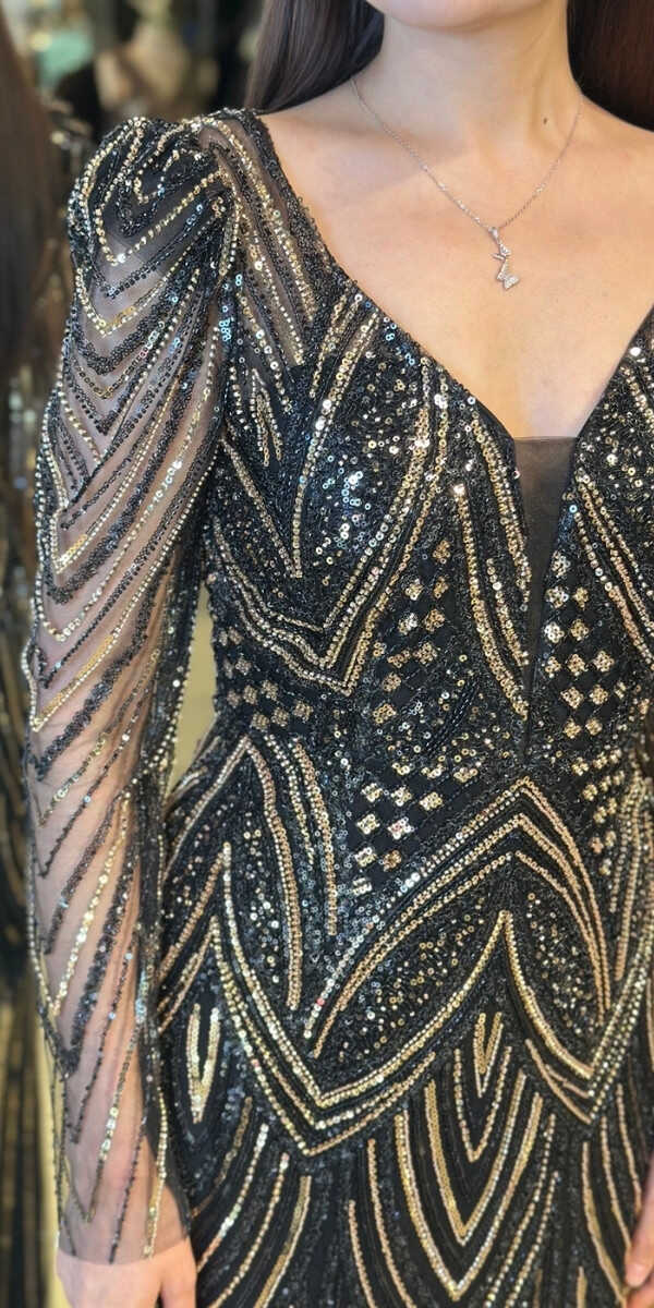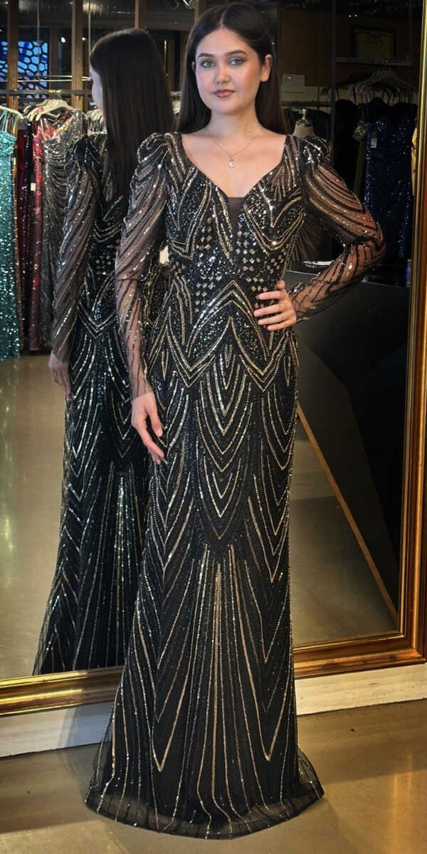 Siyah Uzun Kollu V Yaka Düz Kesim Pullu Boncuklu Uzun Abiye Elbise 7732