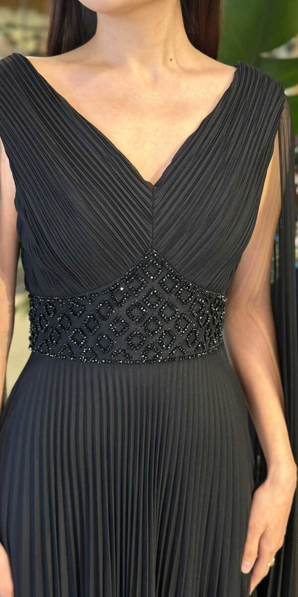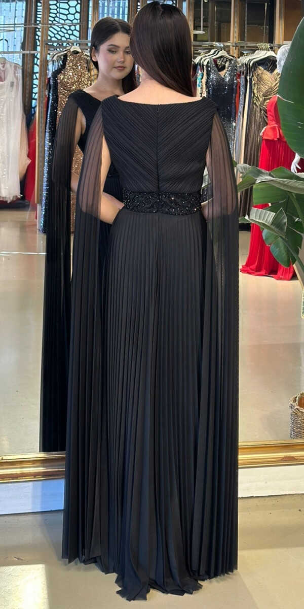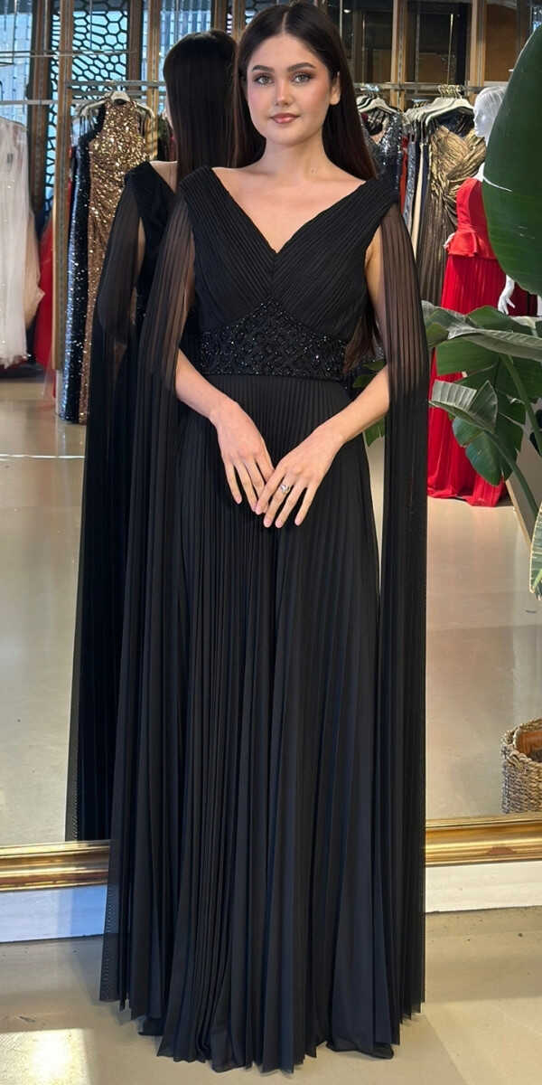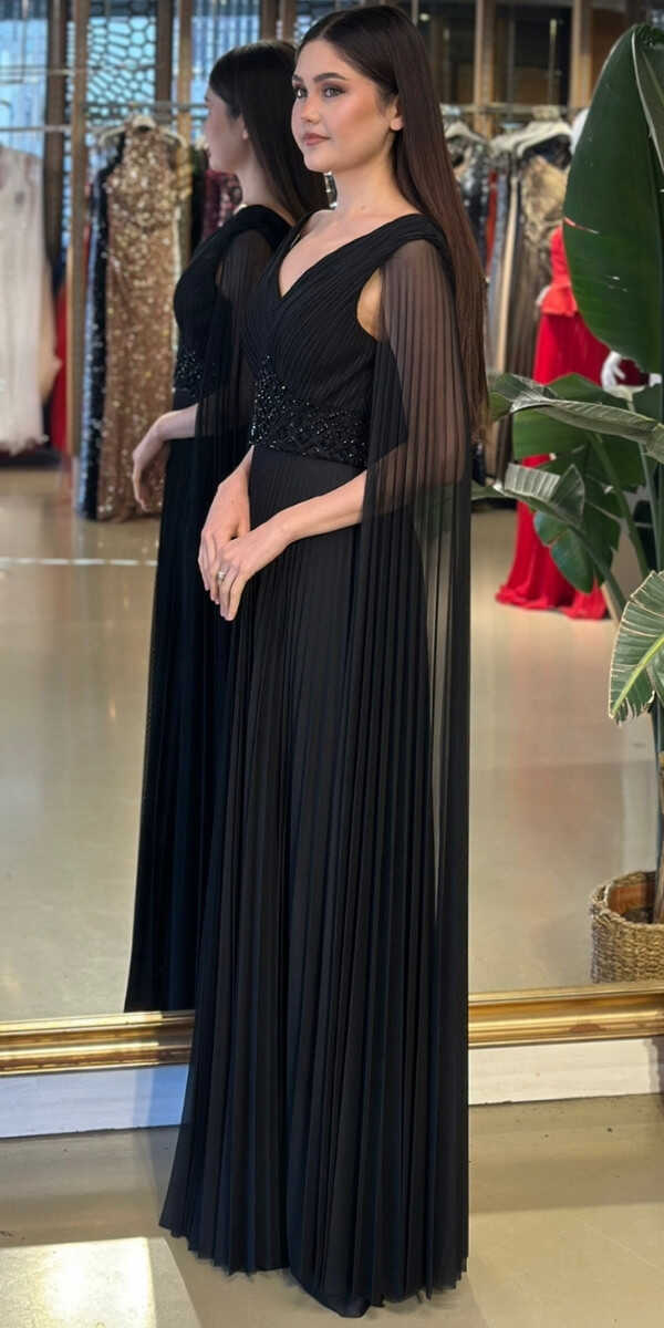 V Yaka Siyah Renk Kloş Etekli Uzun Abiye Elbise, Şifon Kumaştan Üretilmiş olup Uçuş Uçuş Şifon Kumaş Tüm Dikkatleri Üzerinize Toplayacaktır. Çıkarılabilir peleriniyle iki farklı kullanım imkânı sunar.