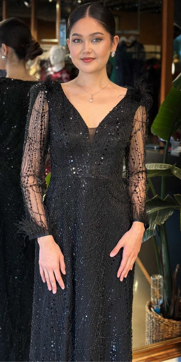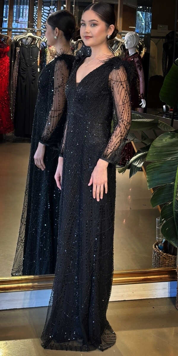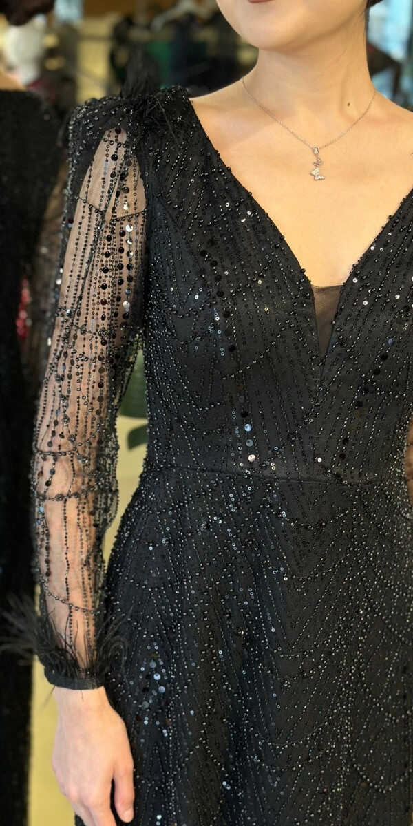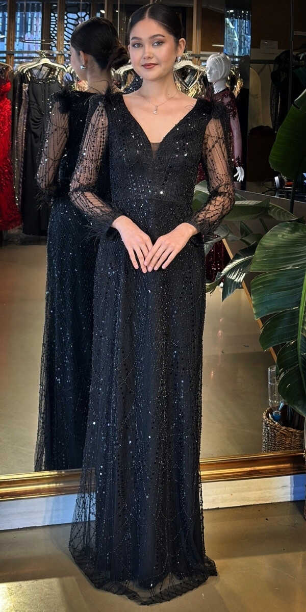 V Yaka Siyah Renk Düz Kesim Uzun Abiye Elbise, Pullu Boncuklu Kumaştan Üretilmiş olup Parıltı ve Zarafetin Buluştuğu Kumaş Türü Sizi Işıl Işıl Gösterecektir. Uzun kollarıyla, kollarınızı zarif bir şekilde kapatır. Uçuşan Tüy Detay Sizi Oldukça Havalı Gösterecek.
