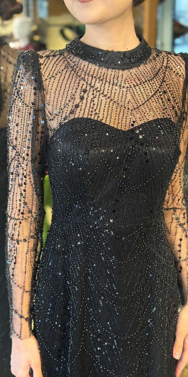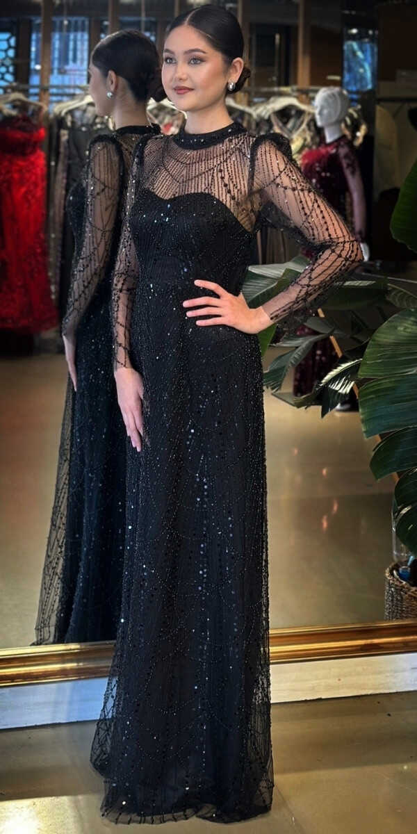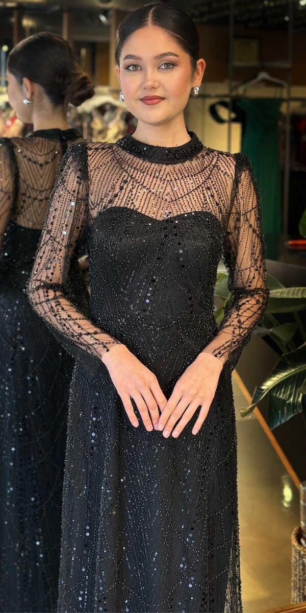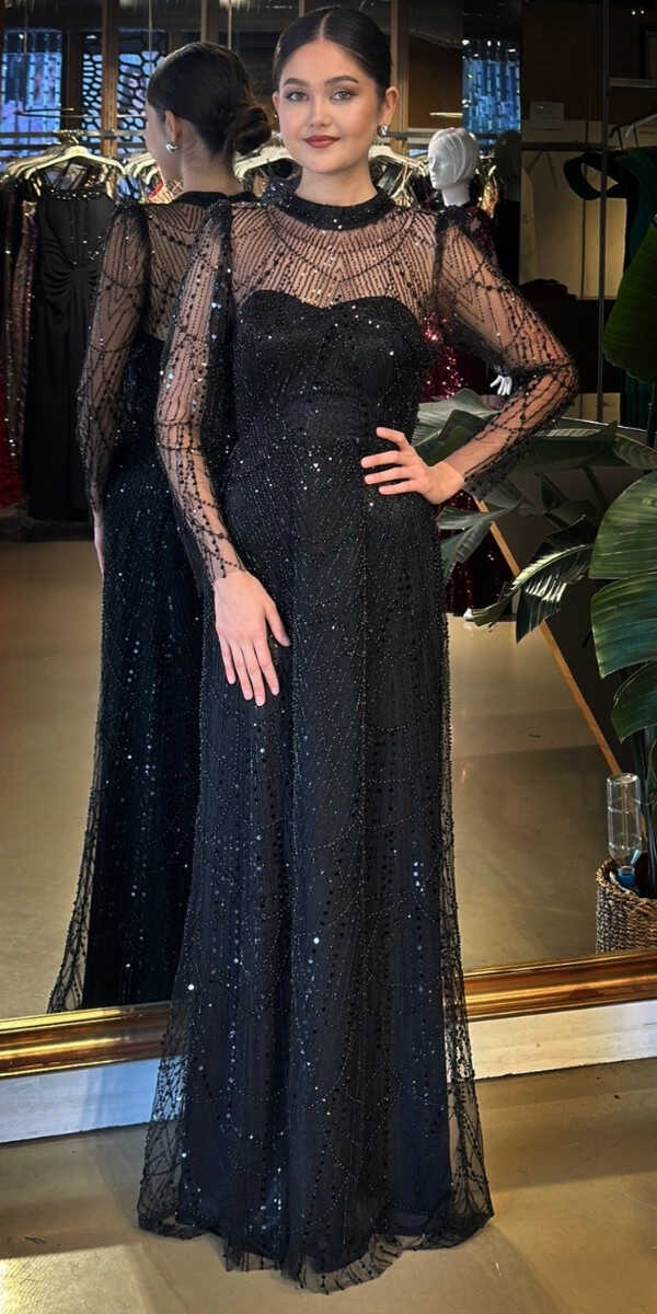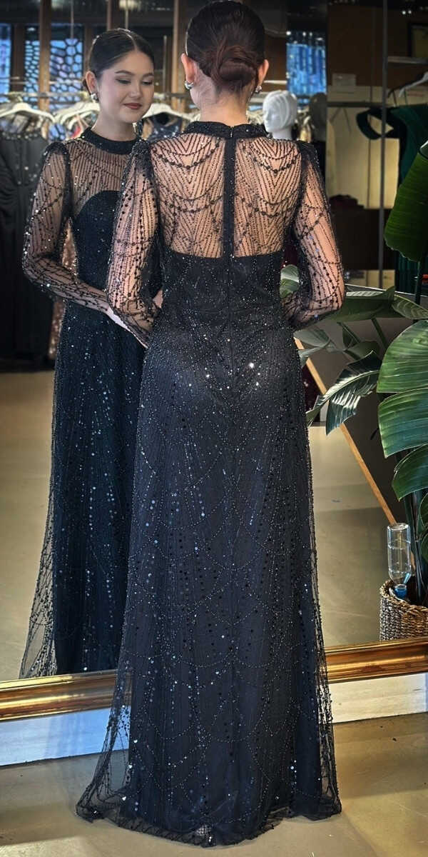 Yuvarlak Yaka Siyah Renk Düz Kesim Uzun Abiye Elbise, Pullu Boncuklu Kumaştan Üretilmiş olup Parıltı ve Zarafetin Buluştuğu Kumaş Türü Sizi Işıl Işıl Gösterecektir. Uzun kollarıyla, kollarınızı zarif bir şekilde kapatır.