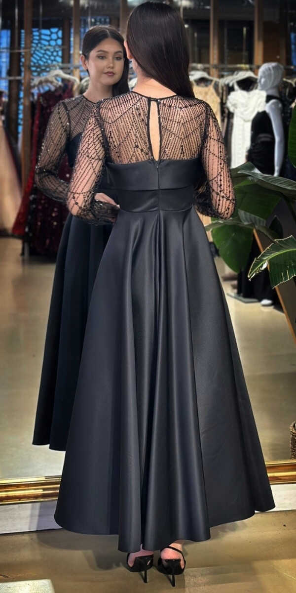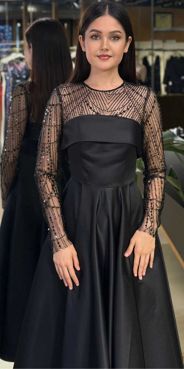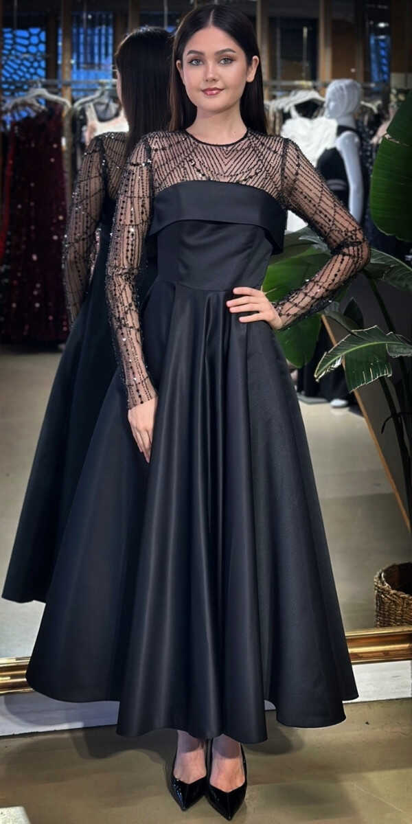 Yuvarlak Yaka Siyah Renk Kloş Etekli Midi Abiye Elbise, Saten Kumaştan Üretilmiş olup Satenin Pürüzsüz Işığı Görünümünüze Zarafet Katacaktır. Uzun kollarıyla, kollarınızı zarif bir şekilde kapatır.