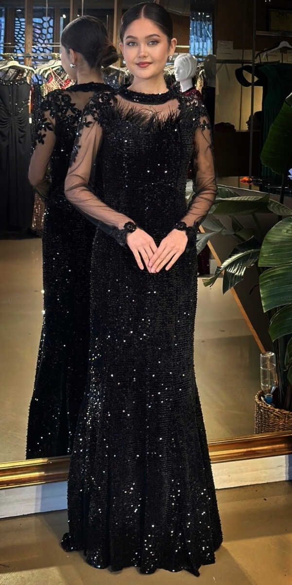 Gelince Haber VerYuvarlak Yaka Siyah Renk Balık Etekli Uzun Abiye Elbise, Pul Payet Kumaştan Üretilmiş olup Likralı ve Payet İşlemeli Kumaşı, Dikkat Çekici Işıltısının Yanı Sıra Vücudunuzu Sararak Sizi Olduğunuzdan İnce Gösterecektir. Vücuda uyum sağlayan likralı kumaş, dinamik bir duruş kazandırır. Uzun kollarıyla, kollarınızı zarif bir şekilde kapatır. Uçuşan Tüy Detay Sizi Oldukça Havalı Gösterecek.