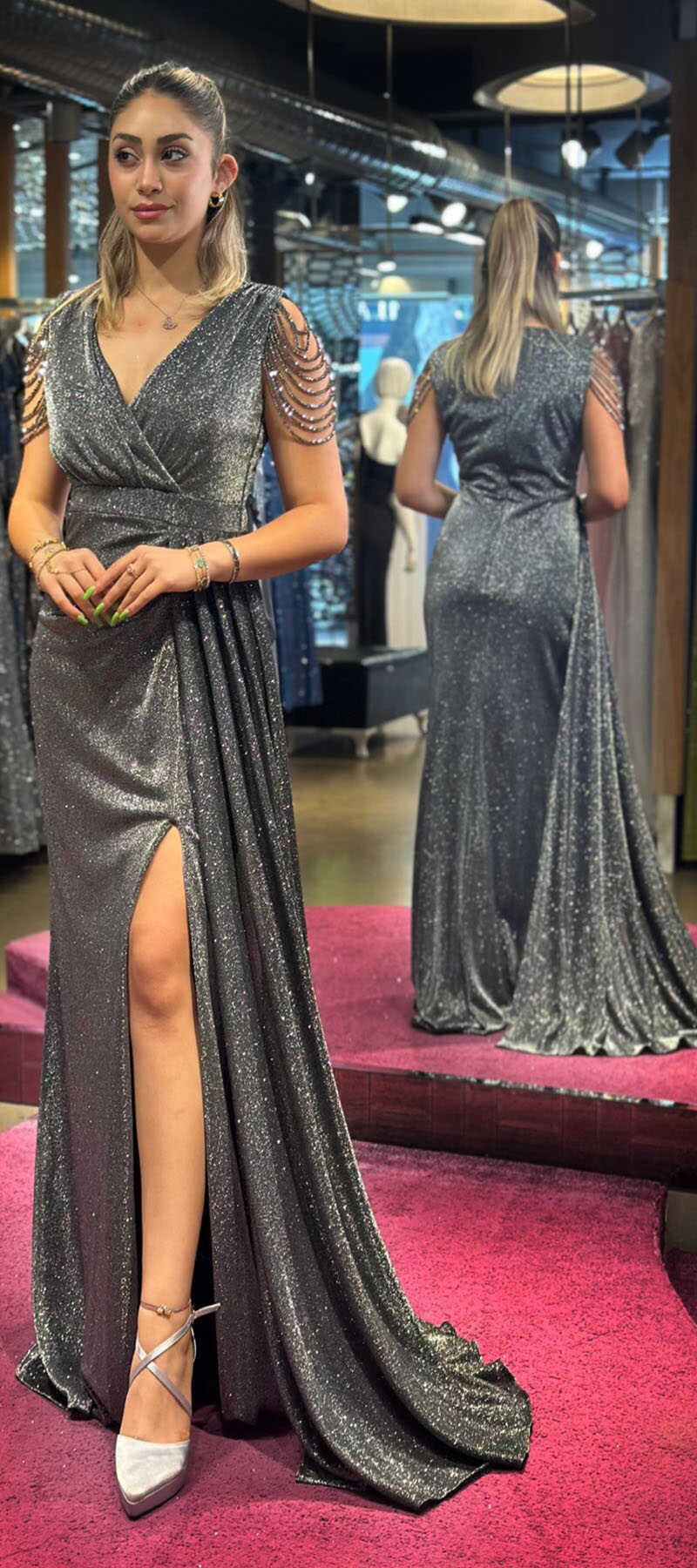 Siyah&Gümüş Renk Düz Kesim Uzun Abiye Elbise, Kumaştan Üretilmiş Olup Yırtmaç Detayı Cesur ve Çarpıcı Bir Stil Sunacaktır.