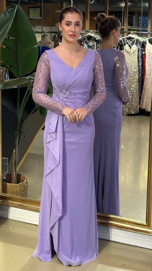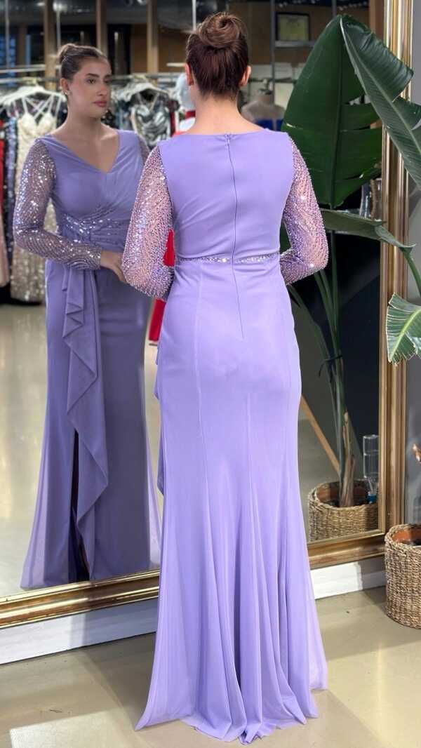 Beyaz Uzun Kollu Balık Etekli Simli Uzun Abiye Elbise 7372
