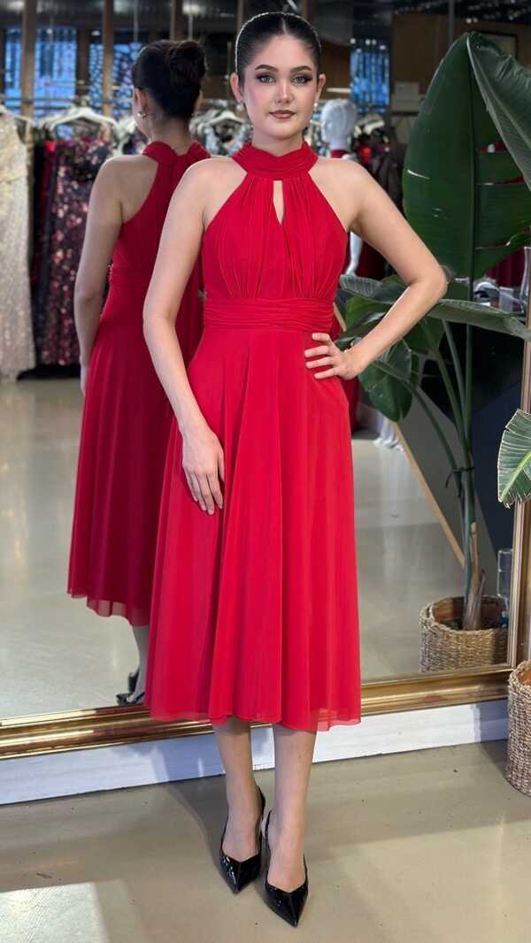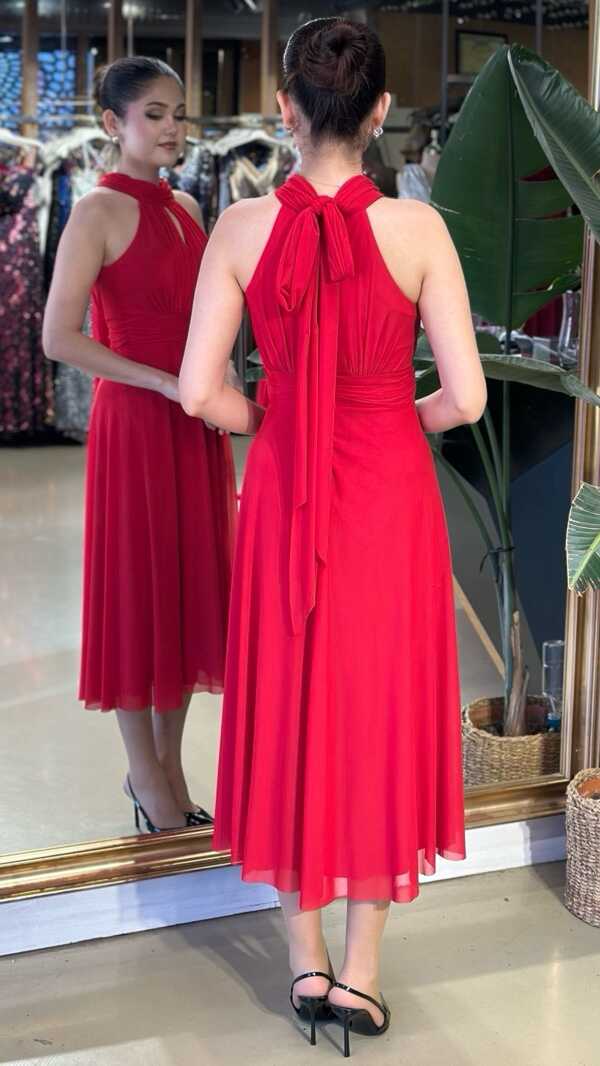 Petrol Renk Kalın Askı Kloş Etekli Likralı Midi Abiye Elbise 7240