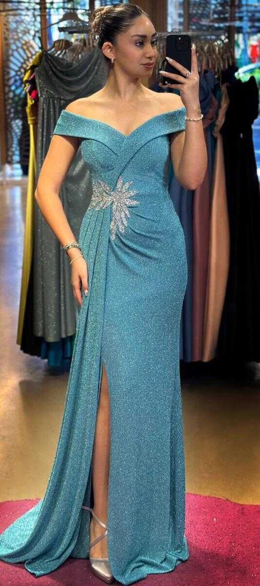 Turkuaz Renk Düz Kesim Uzun Abiye Elbise, Simli Kumaştan Üretilmiş Olup Simlerin Işıltısıyla Çok Hoş Gözükeceksiniz Taşlı Aksesuar Dikkatleri Üzerinizde Toplayacak. Yırtmaç Detayı Cesur ve Çarpıcı Bir Stil Sunacaktır.