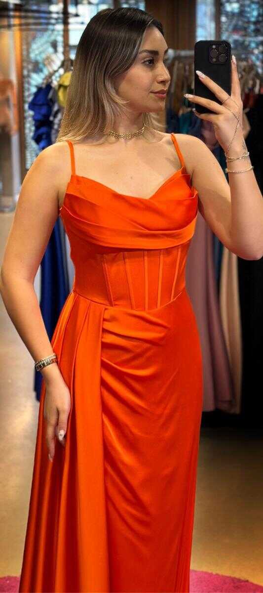 Turuncu İnce Askılı Yırtmaçlı Düz Kesim Saten Uzun Abiye Elbise 7564