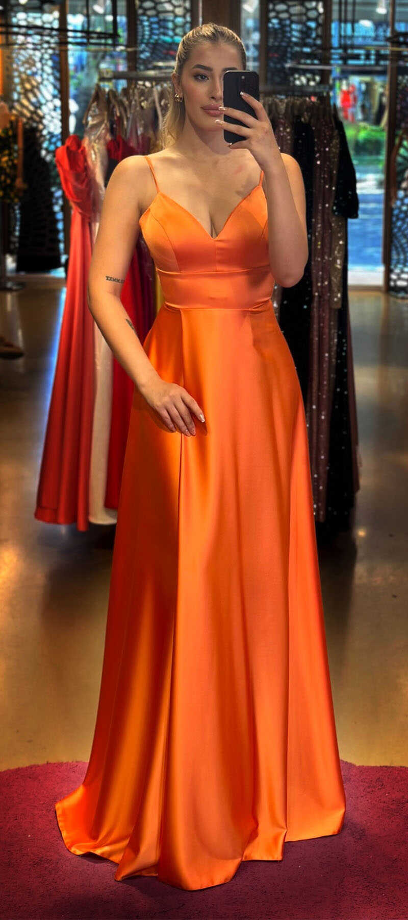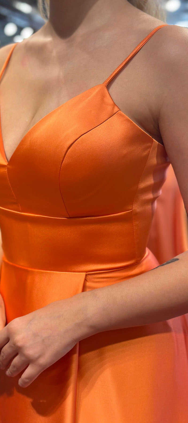 Turuncu Renk Kloş Etekli Uzun Abiye Elbise, Saten Kumaştan Üretilmiş Olup Satenin Pürüzsüz Işığı Görünümünüze Zarafet Katacaktır. Elbisedeki İp Askılar Kullanım Kolaylığı Yaratacaktır. Şık Sırt Dekoltesi Size Çok Yakışacak. Adeta Göz Kamaştıran Bir Görünüm Yaratacak.
