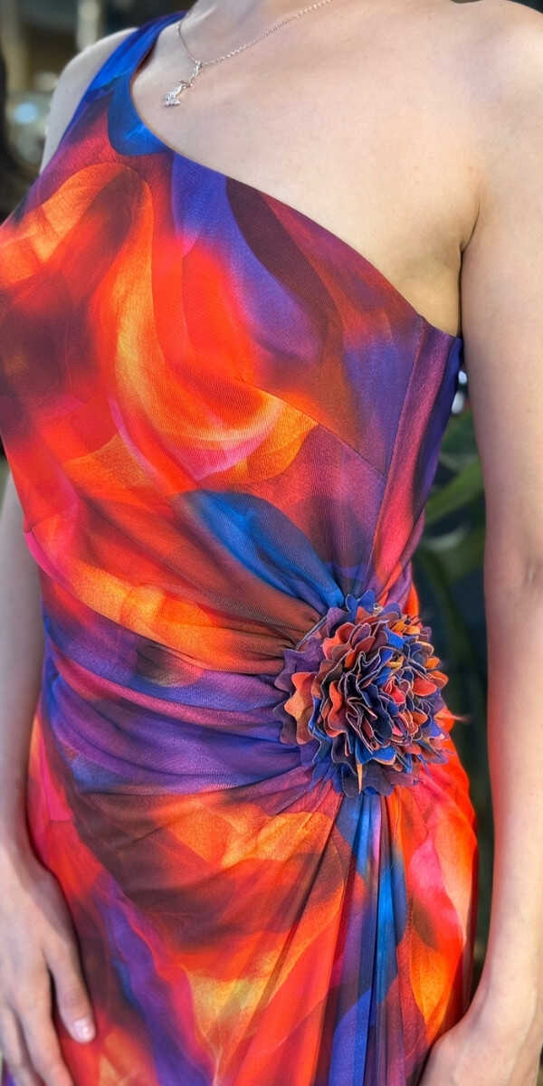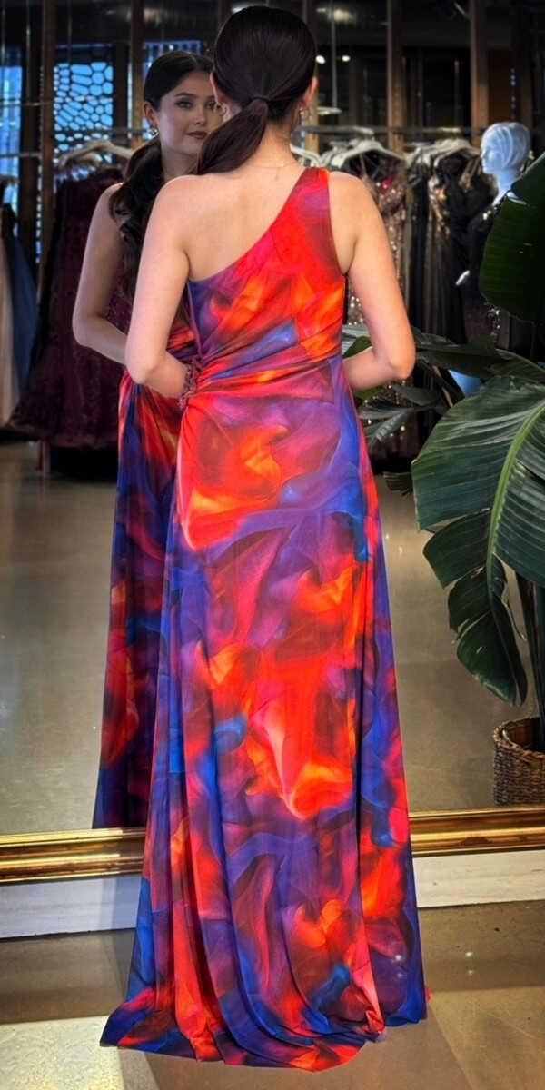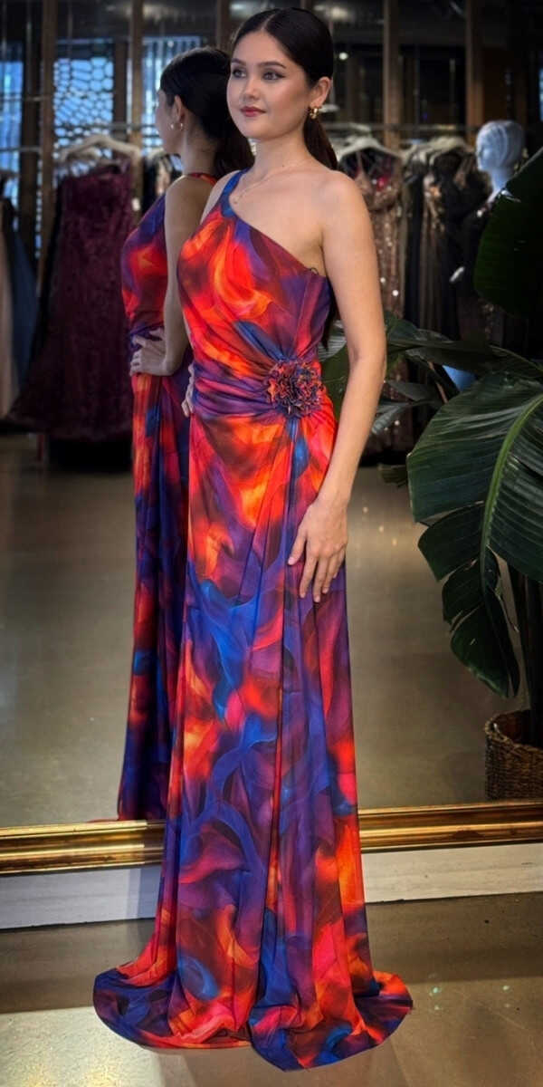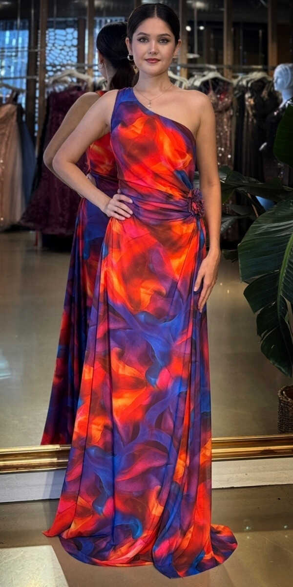 Turuncu Renk Kloş Etekli Uzun Abiye Elbise, Desenli Kumaştan Üretilmiş olup Sahil Ve Kır Düğünlerinin Vazgeçilmezi olacaktır. Tek omuz detayıyla modern bir ifade oluşturur. Çiçek Detayı Modern Bir Görünüm Yaratacaktır.