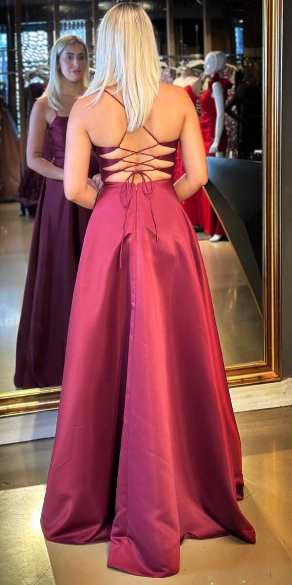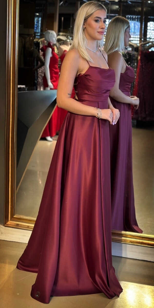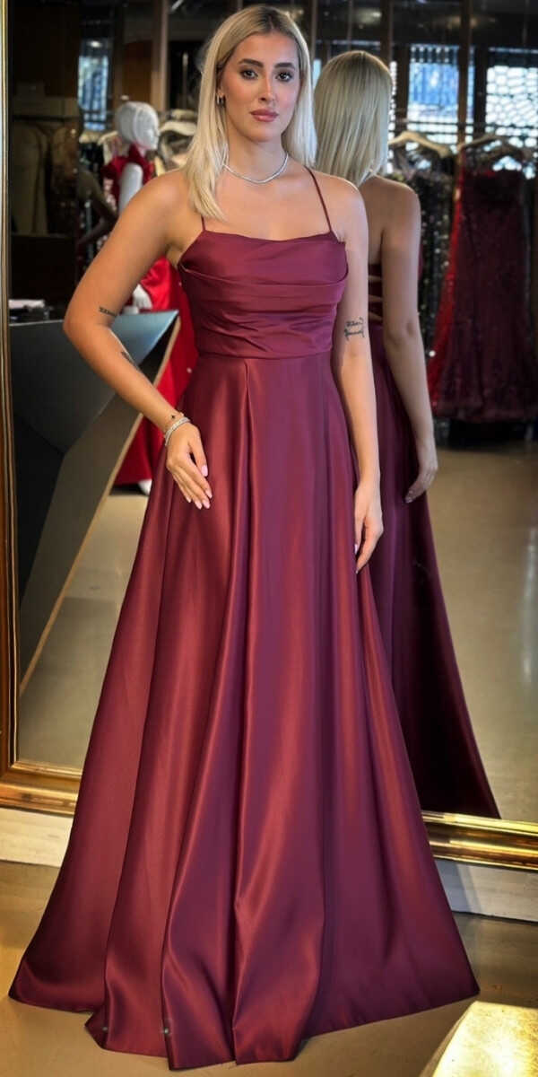 Vişne İp Askılı Sırt Dekolteli Kloş Etekli Saten Uzun Abiye Elbise 7764