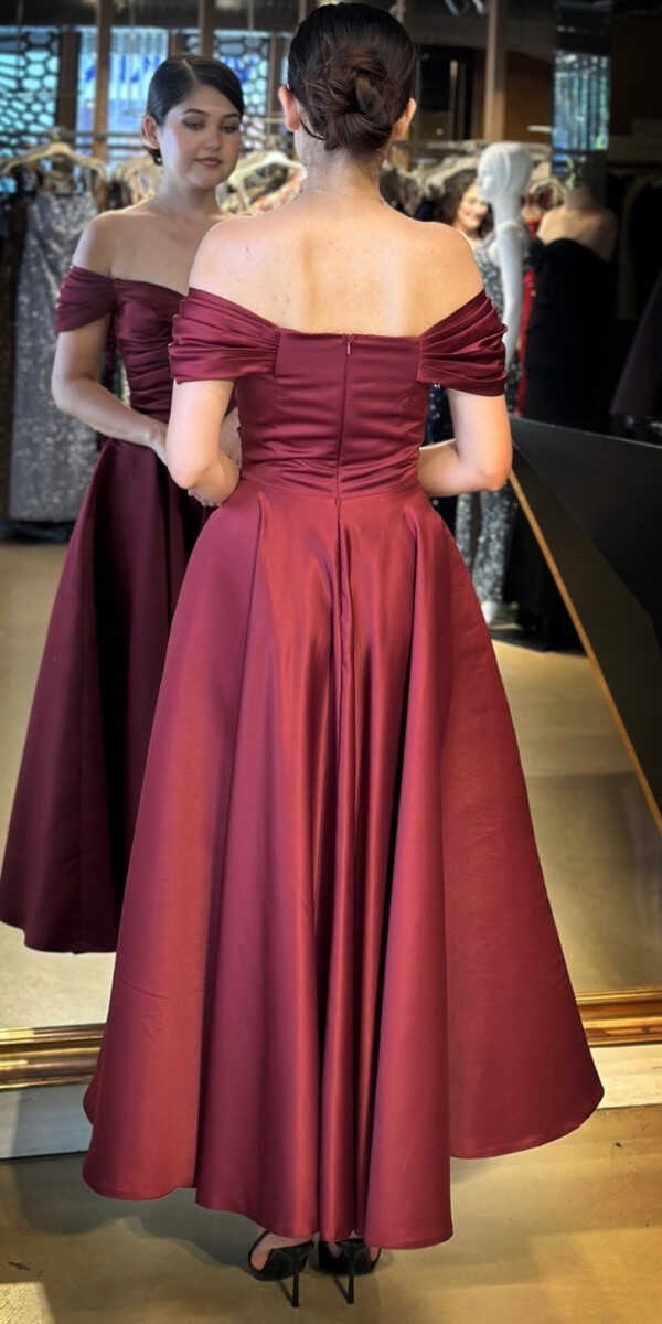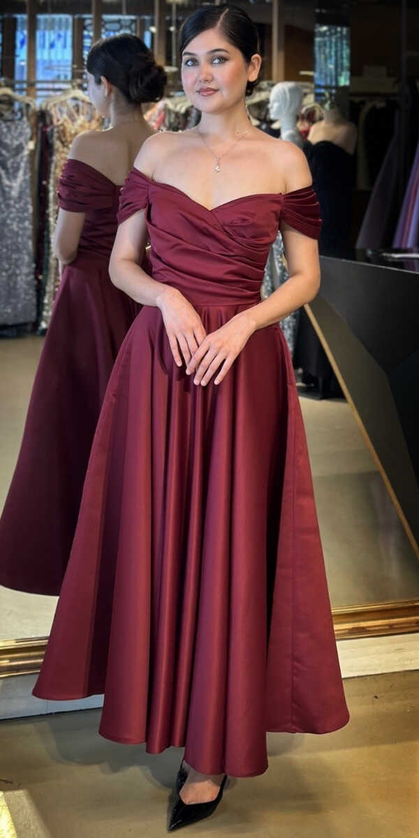 Vişne Renk Renk Kloş Etekli Midi Abiye Elbise, Saten Kumaştan Üretilmiş olup Satenin Pürüzsüz Işığı Görünümünüze Zarafet Katacaktır.