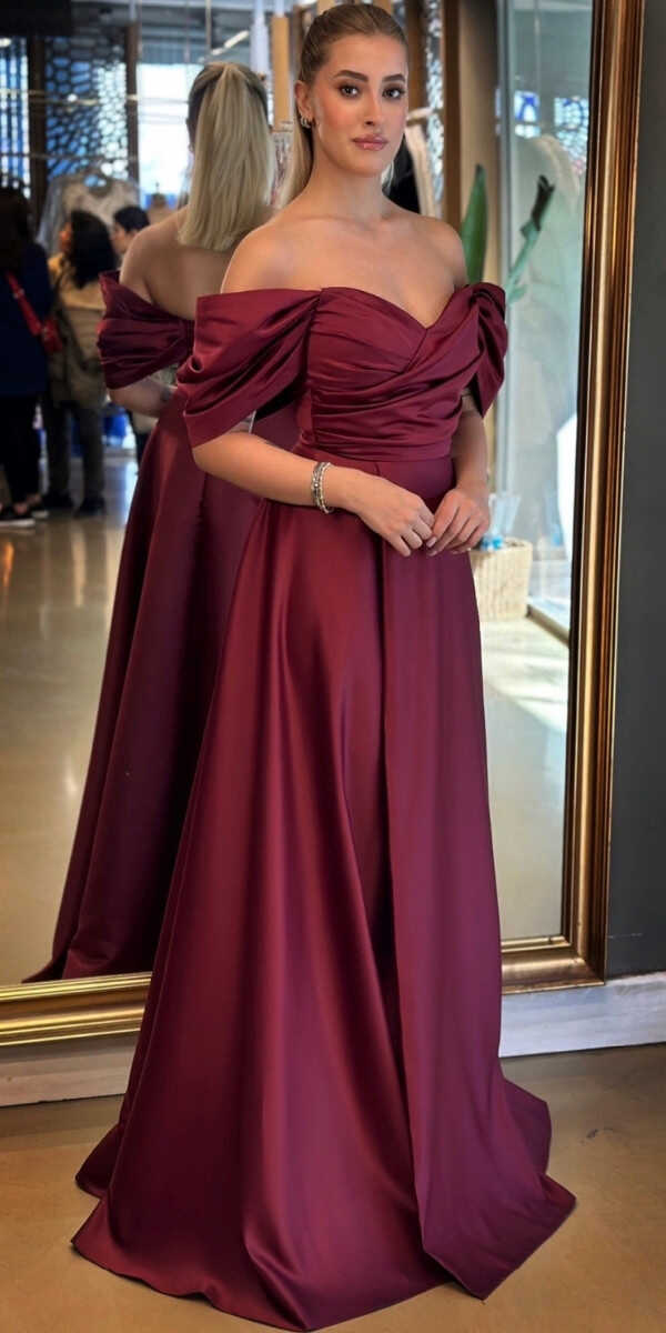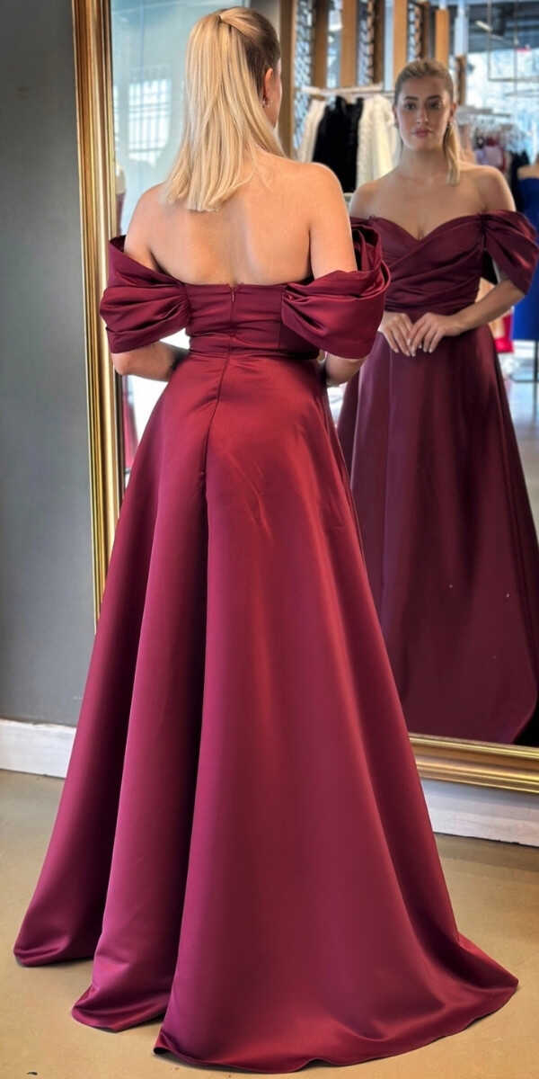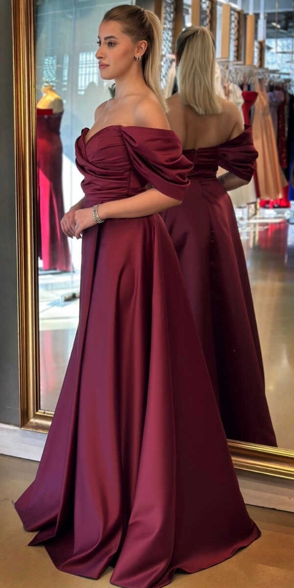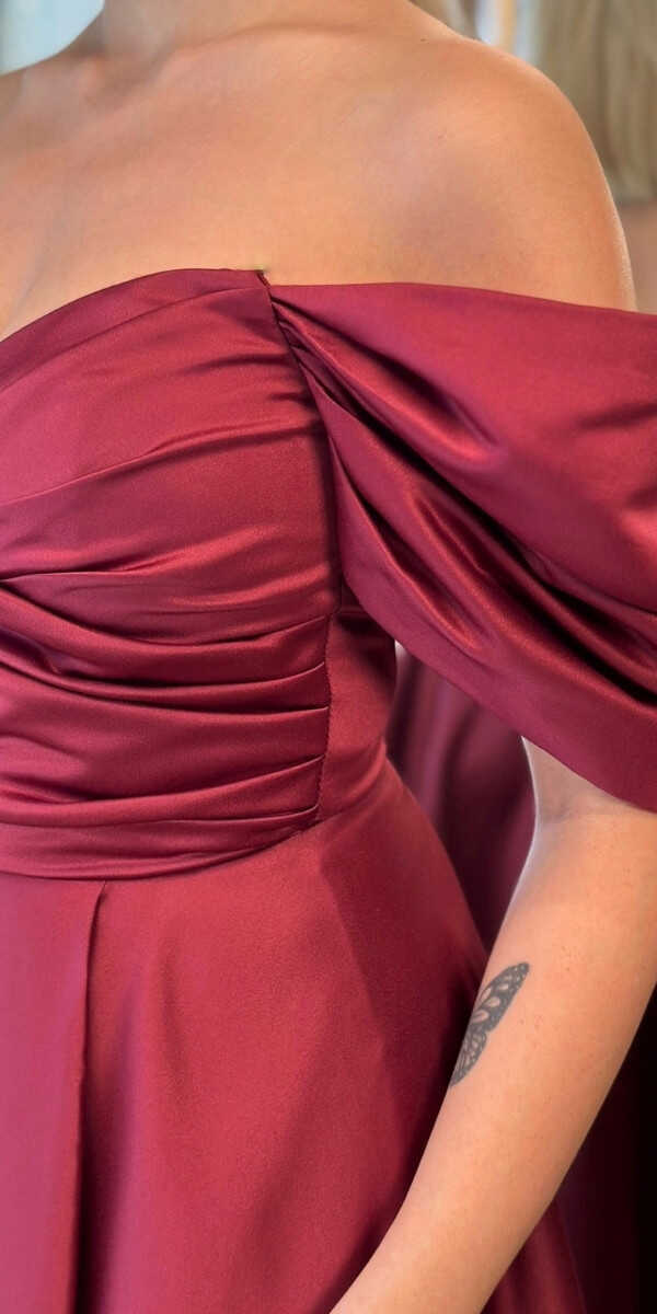 Vişne Renk Kloş Etekli Uzun Abiye Elbise, Saten Kumaştan Üretilmiş Olup Satenin Pürüzsüz Işığı Görünümünüze Zarafet Katacaktır.