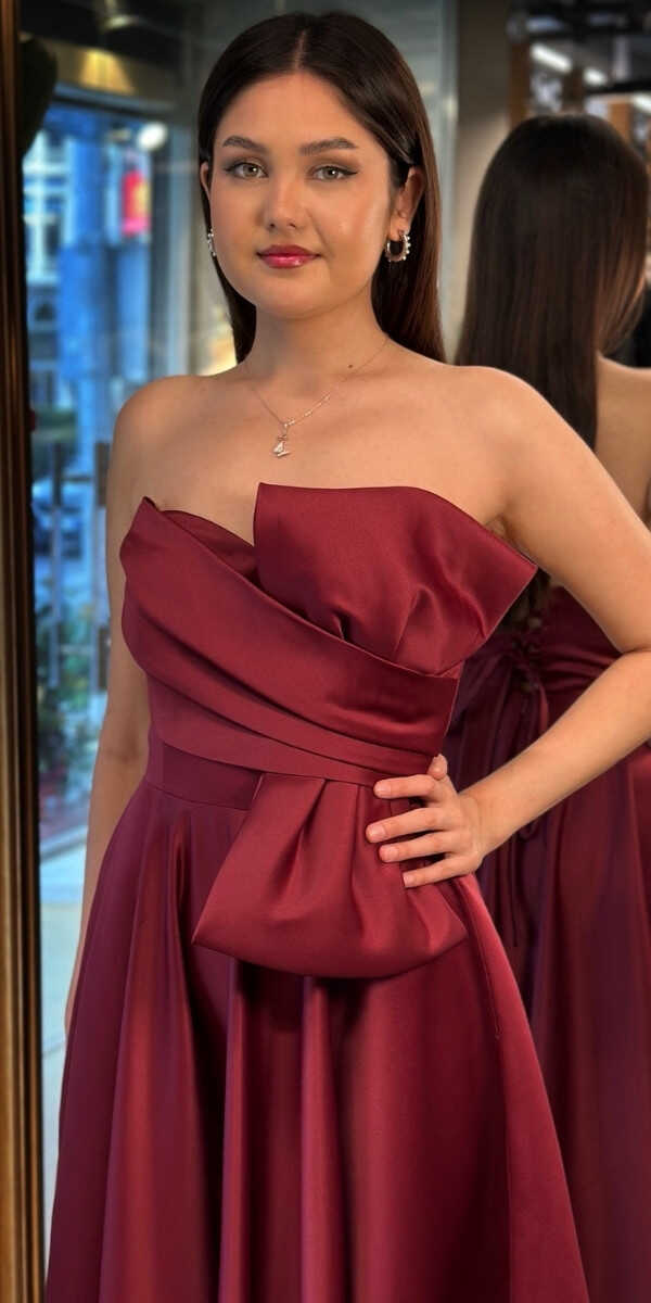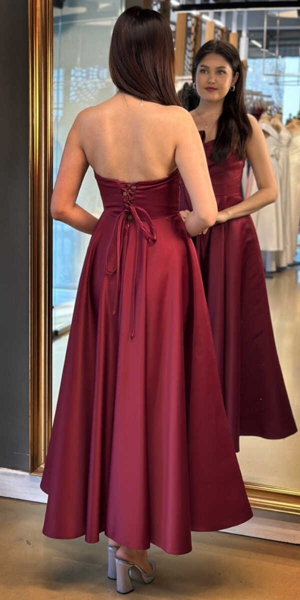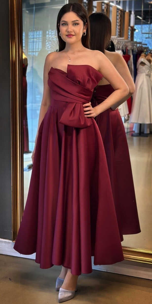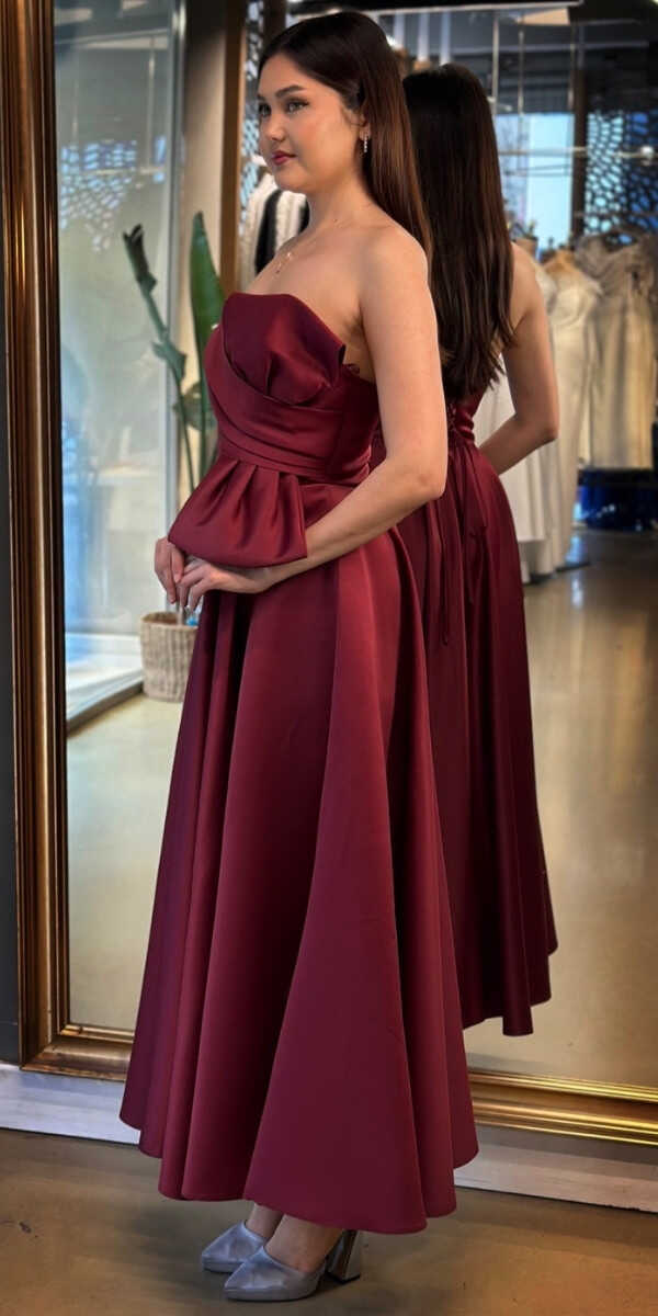 Vişne Renk Kloş Etekli Midi Abiye Elbise, Saten Kumaştan Üretilmiş Olup Satenin Pürüzsüz Işığı Görünümünüze Zarafet Katacaktır.