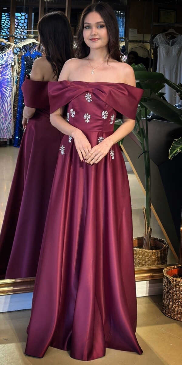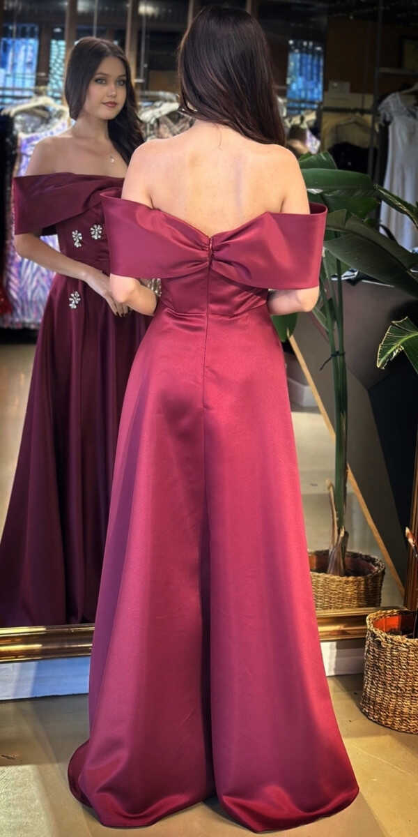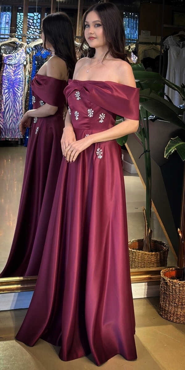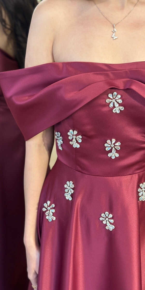Madonna Yaka Vişne Renk Renk Kloş Etekli Uzun Abiye Elbise, Saten Kumaştan Üretilmiş olup Satenin Pürüzsüz Işığı Görünümünüze Zarafet Katacaktır. Taşlı Aksesuar Dikkatleri Üzerinizde Toplayacak.