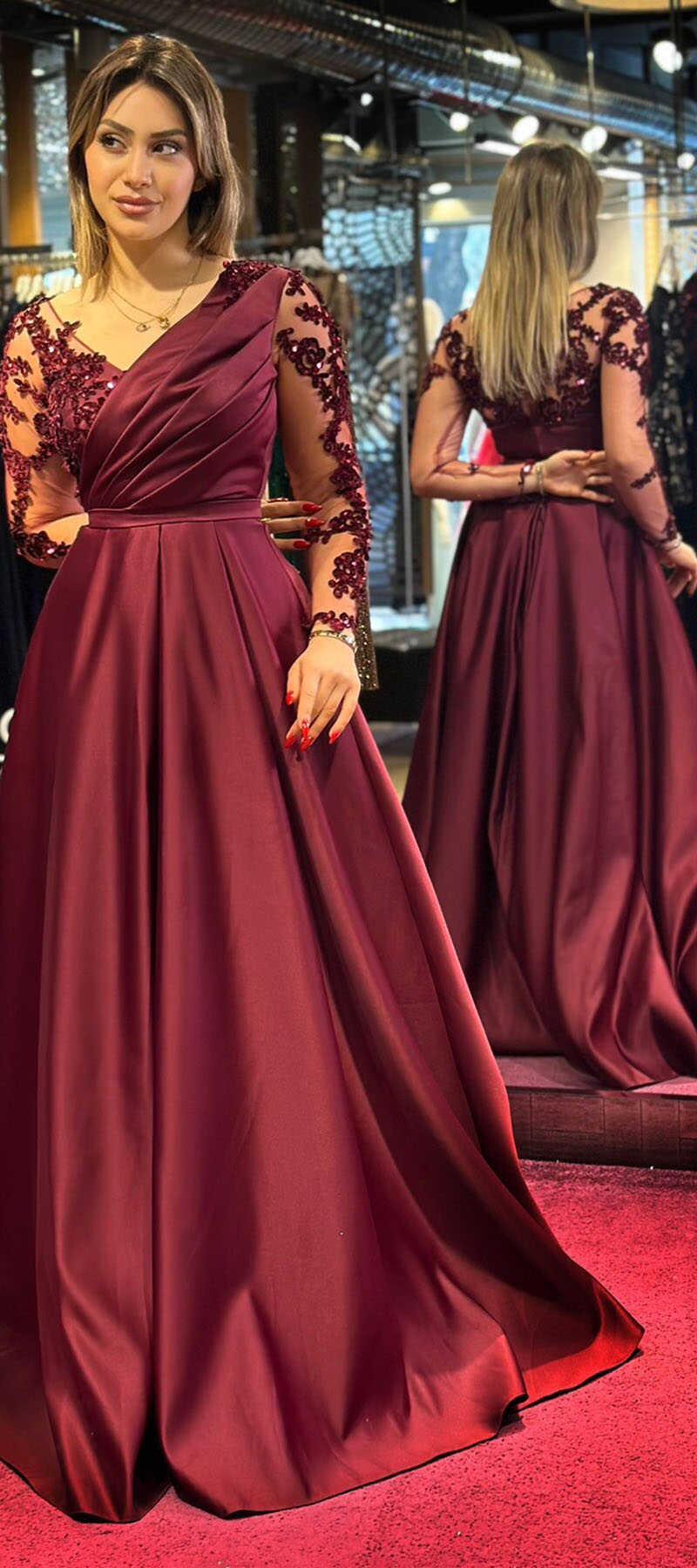 Vişne Renk Kloş Etekli Uzun Abiye Elbise, Saten Kumaştan Üretilmiş olup Dantel Detayı Işıltısıyla Göz Kamaştıracakır..