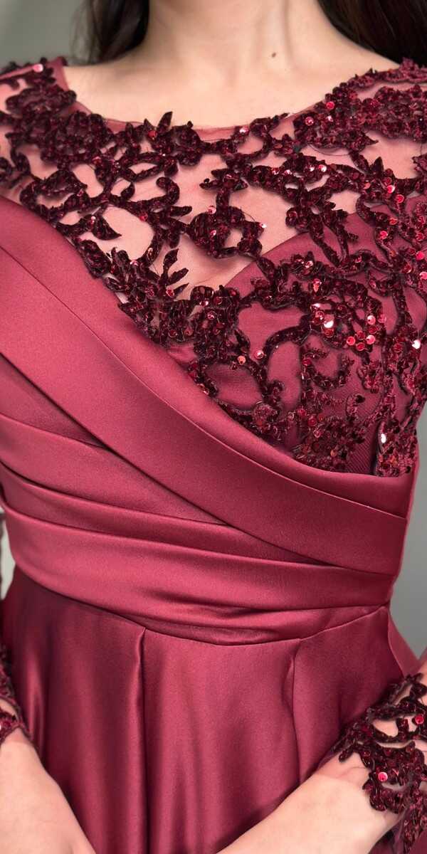 Vişne Renk Kloş Etekli Uzun Abiye Elbise, Saten Kumaştan Üretilmiş Olup Satenin Pürüzsüz Işığı Görünümünüze Zarafet Katacaktır. Dantel Detayı Işıltısıyla Göz Kamaştıracakır.