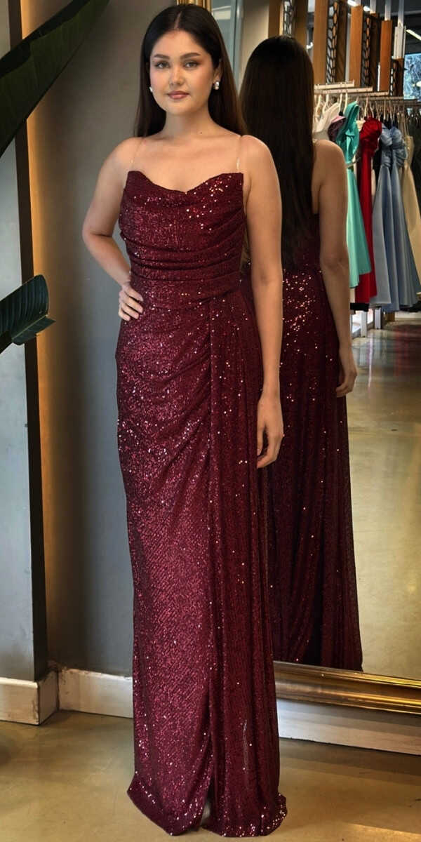 Vişne Renk Düz Kesim Uzun Abiye Elbise, Payet Kumaştan Üretilmiş Olup Pırıltısıyla Göz Kamaştıracaktır. Yırtmaç Detayı Cesur ve Çarpıcı Bir Stil Sunacaktır.