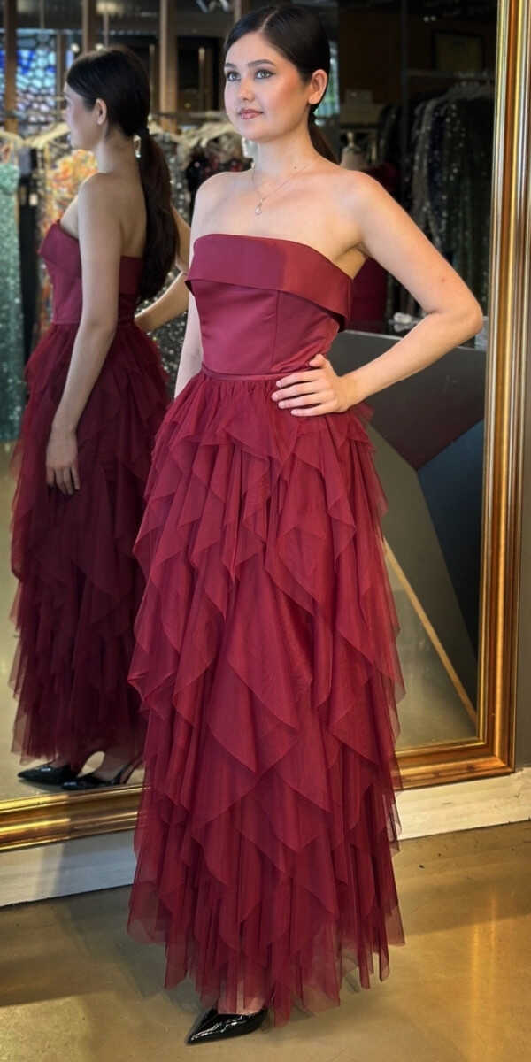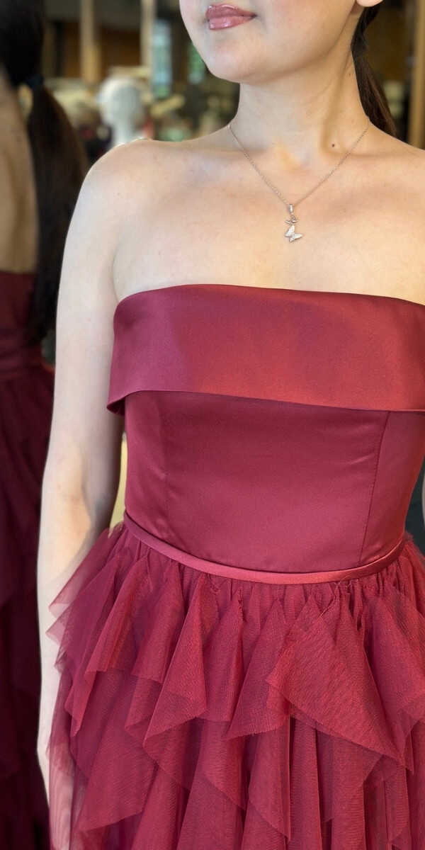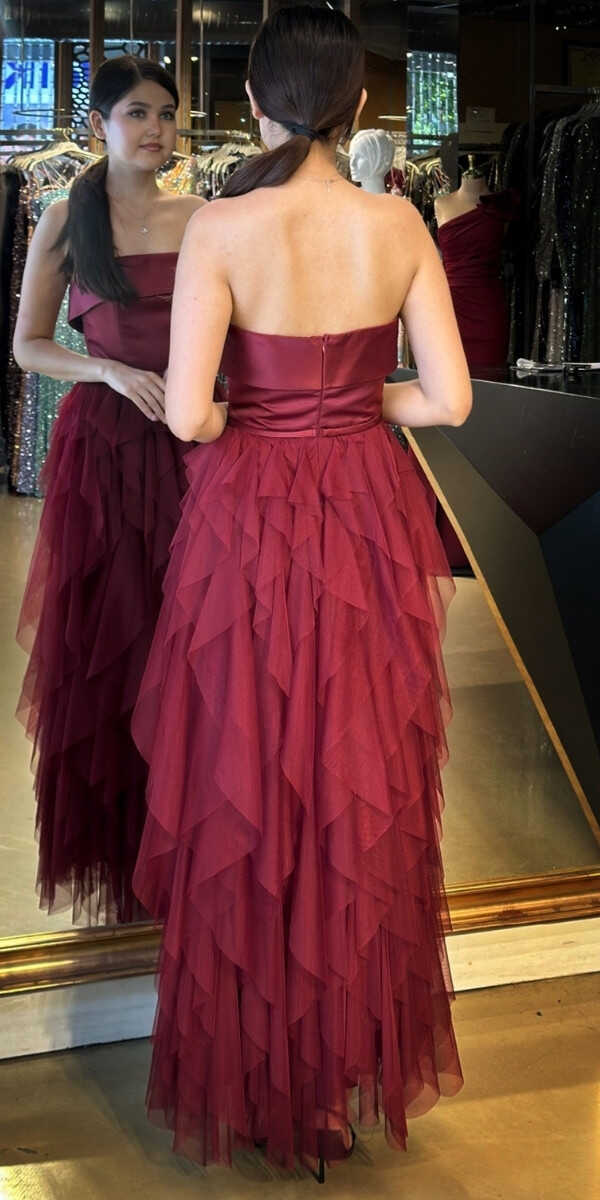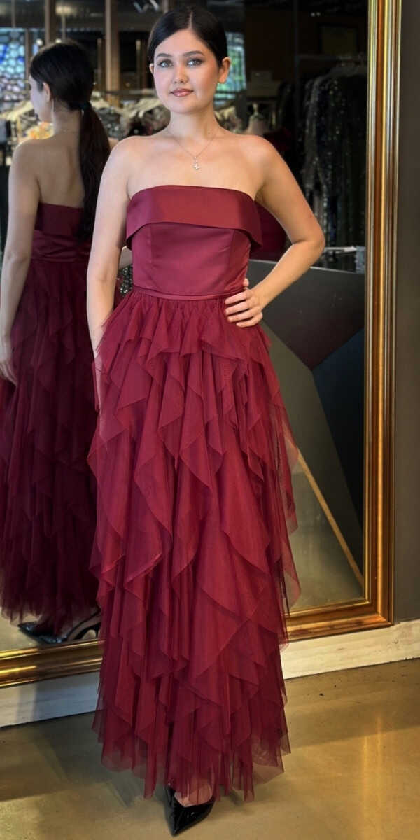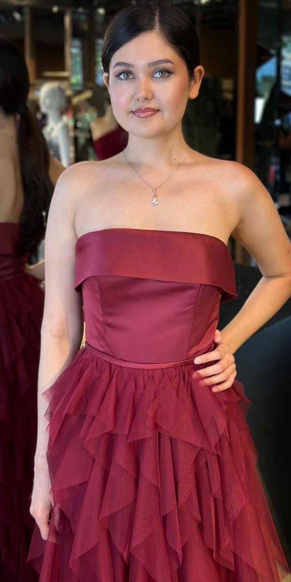 Vişne Renk Renk Kloş Etekli Uzun Abiye Elbise, Tül Kumaştan Üretilmiş olup Hafif Olmasından Kaynaklı Sizi Gece Boyu Rahat Hissettirecek.