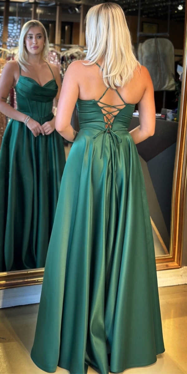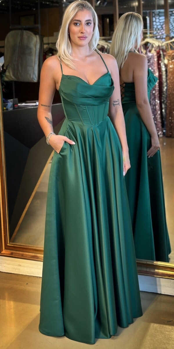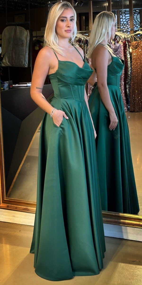 Yeşil Renk Kloş Etekli Uzun Abiye Elbise, Saten Kumaştan Üretilmiş olup Satenin Pürüzsüz Işığı Görünümünüze Zarafet Katacaktır. Elbisedeki İp Askılar Kullanım Kolaylığı Yaratacaktır. Şık Sırt Dekoltesi Size Çok Yakışacak.