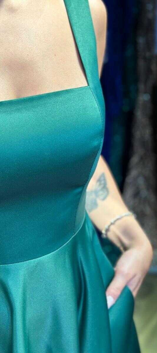 Yeşil Renk Kloş Etekli Midi Abiye Elbise, Saten Kumaştan Üretilmiş Olup Satenin Pürüzsüz Işığı Görünümünüze Zarafet Katacaktır.