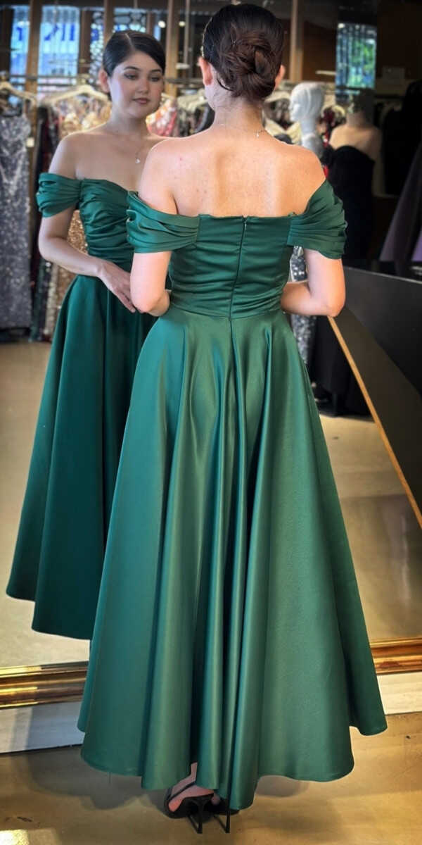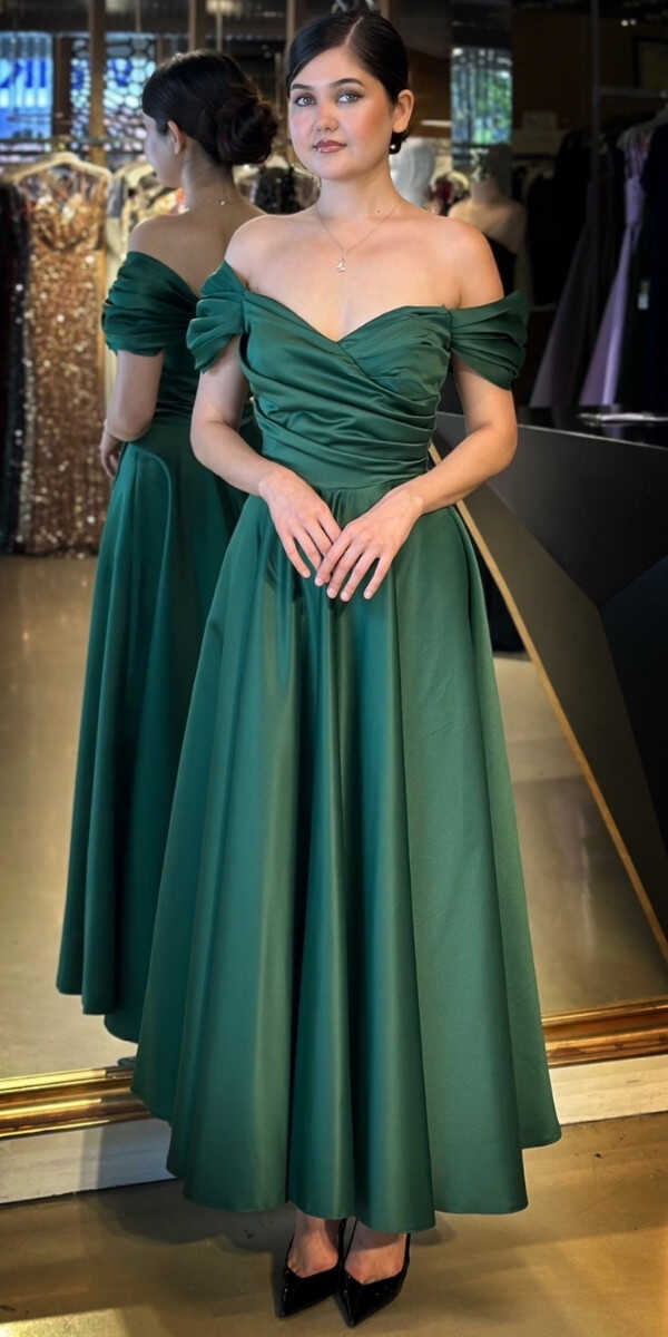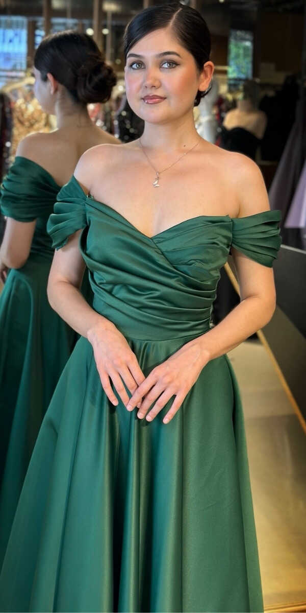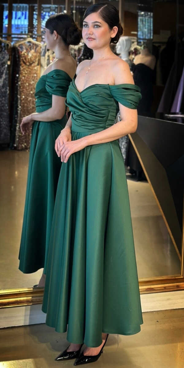 Yeşil Renk Kloş Etekli Midi Abiye Elbise, Saten Kumaştan Üretilmiş olup Satenin Pürüzsüz Işığı Görünümünüze Zarafet Katacaktır.