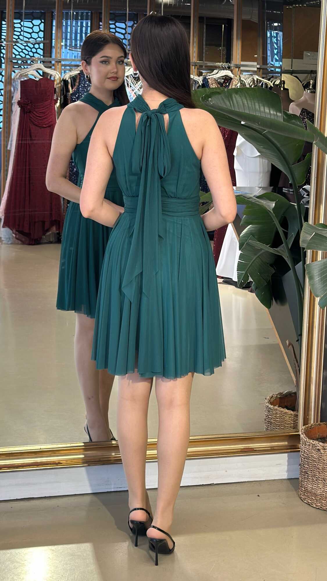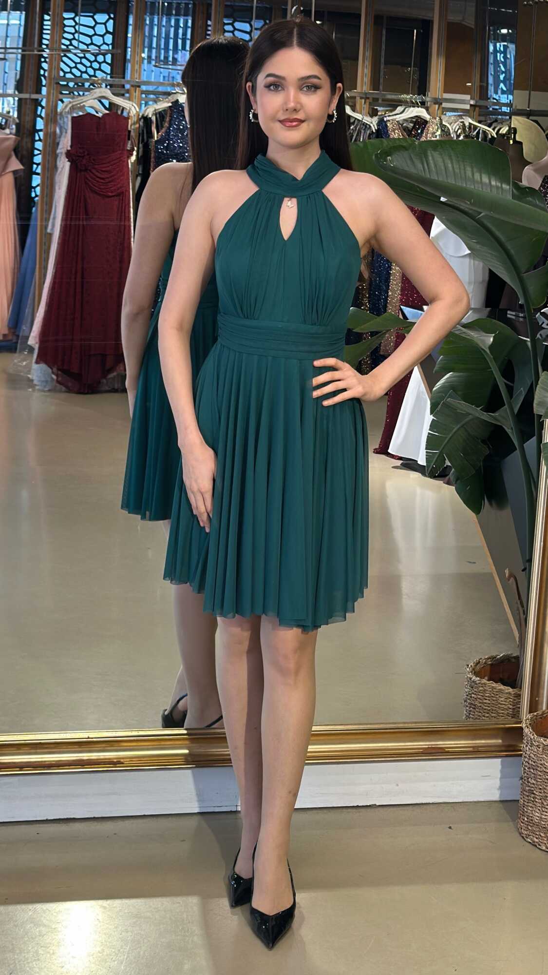 Yeşil Sırt Dekolteli Kloş Etekli Tül Kısa Abiye Elbise 6050