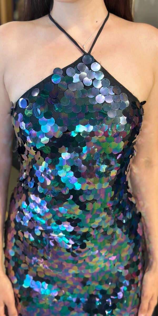 Yeşil Renk Düz Kesim Midi Abiye Elbise, Payet Kumaştan Üretilmiş olup Pırıltısıyla Göz Kamaştıracaktır. Şık Sırt Dekoltesi Size Çok Yakışacak. Yırtmaç Detayı Cesur ve Çarpıcı Bir Stil Sunacaktır.