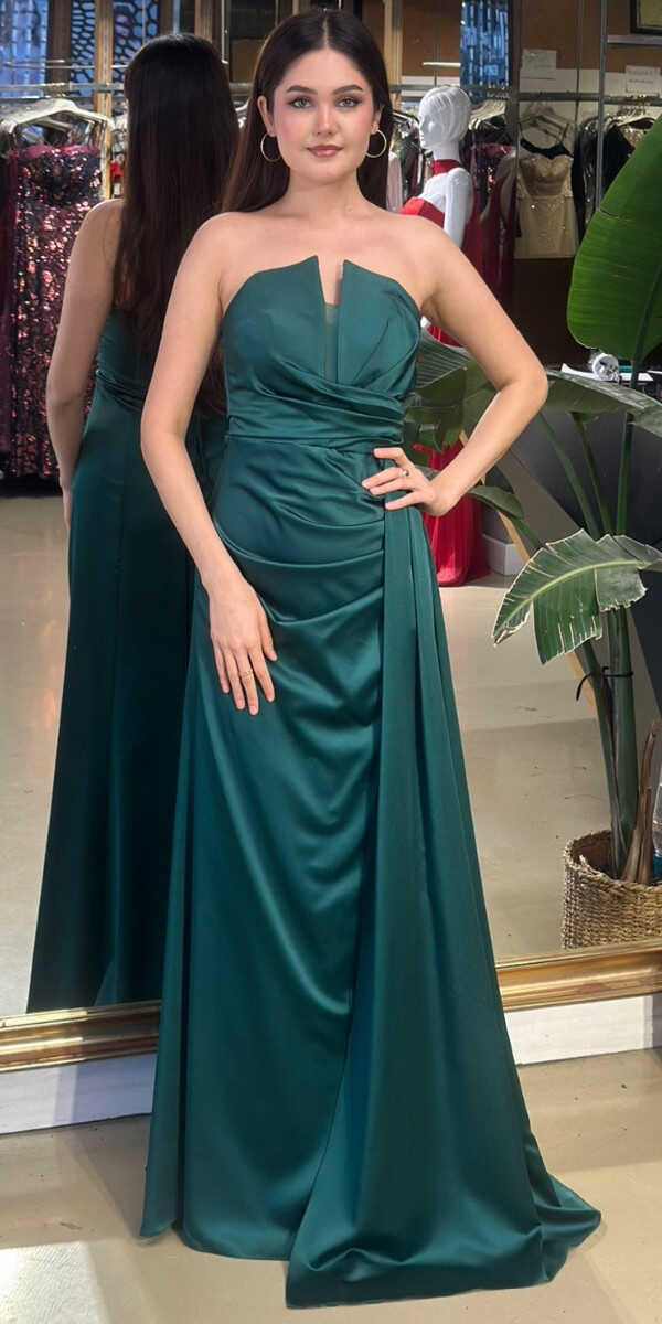 Straplez Yaka Yeşil Renk Düz Kesim Uzun Abiye Elbise, Saten Kumaştan Üretilmiş olup Satenin Pürüzsüz Işığı Görünümünüze Zarafet Katacaktır. Şık Sırt Dekoltesi Size Çok Yakışacak.