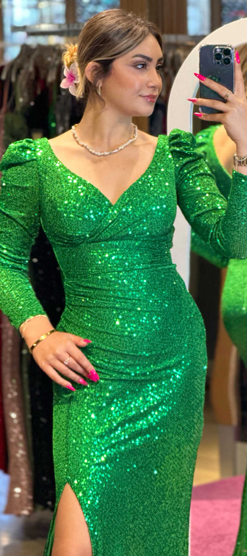 Yeşil Uzun Kollu Yırtmaçlı Düz Kesim Payet Uzun Abiye Elbise 7321